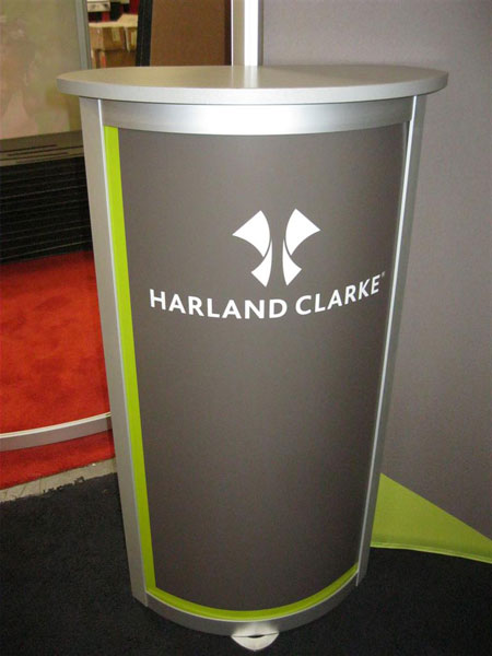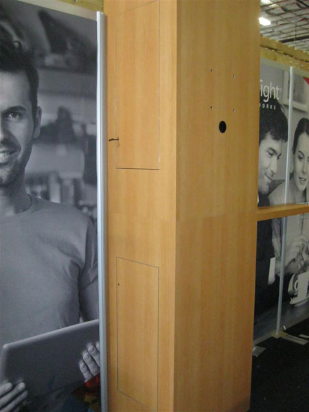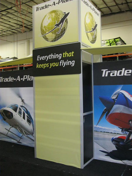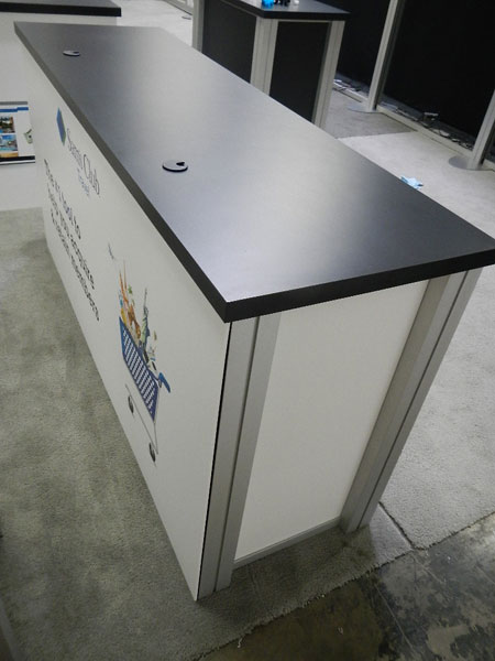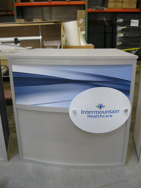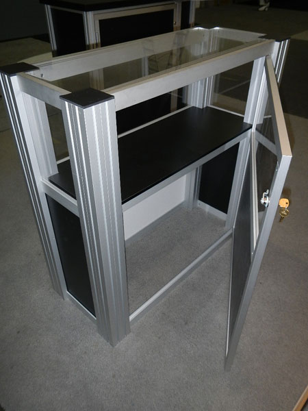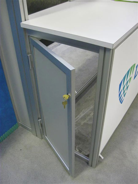 Graphics and Freestanding Backwall Storage Unit with Locking Doors.