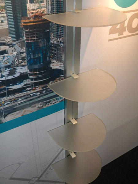 Counter, Small Acrylic Shelves, (8) Halogen Arm Lights, Tension