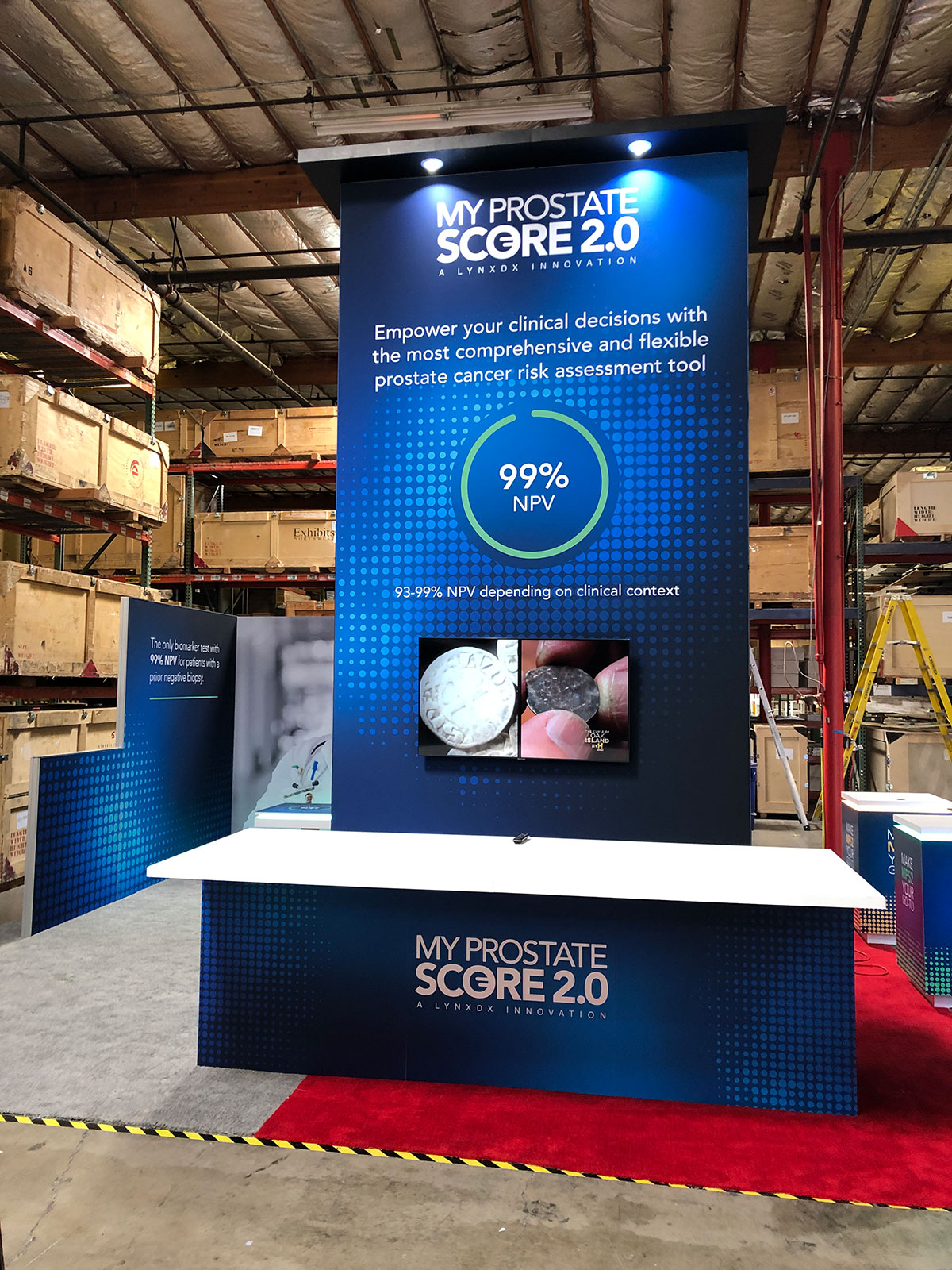 Exhibit with Monitor Mount, Backwall Counter, Shelves, Puck Lights,