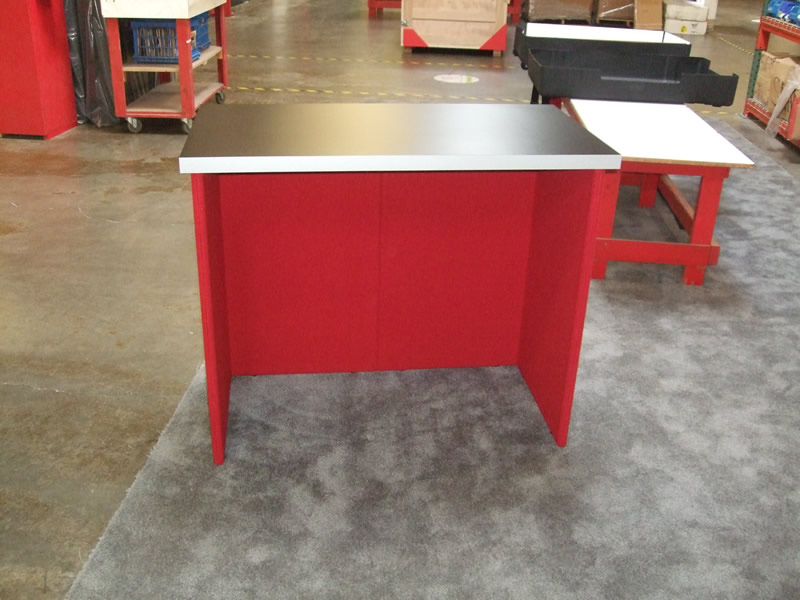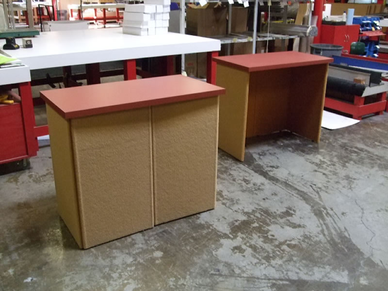 10' x 20' Intro Panel Display with Fabric Slatwall Intro Fabric Panel Rectangle Counters. Some Open Back, Some Closed Back