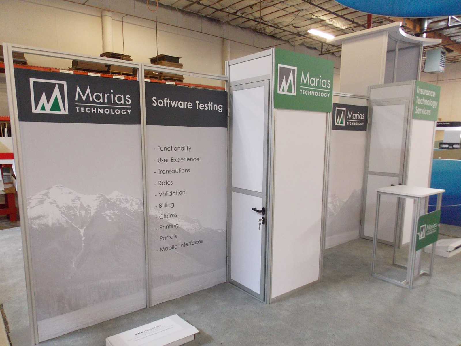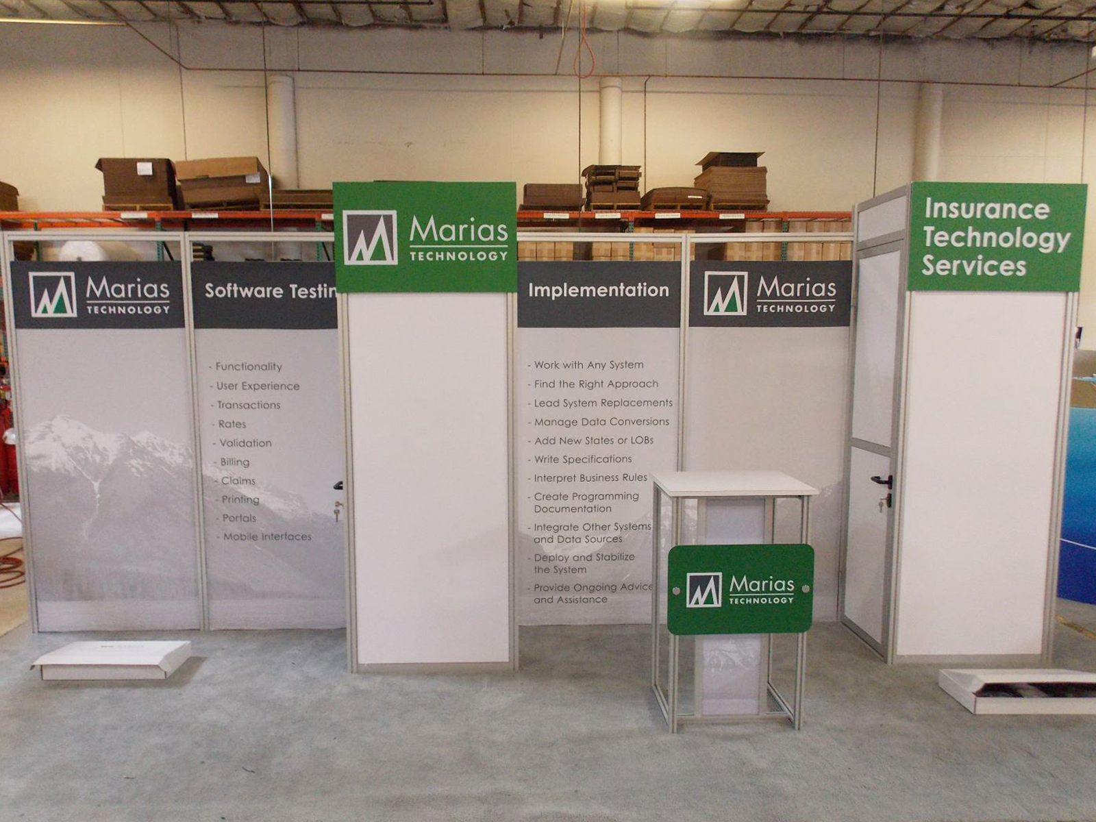 Modified ecoSmart ECO-2034-B Sustainable Exhibit with Fabric and Direct Print Graphics and (2) Locking Storage Towers, (2) 10 x 10 Conversions and a ECO-26C Pedestal [55599]