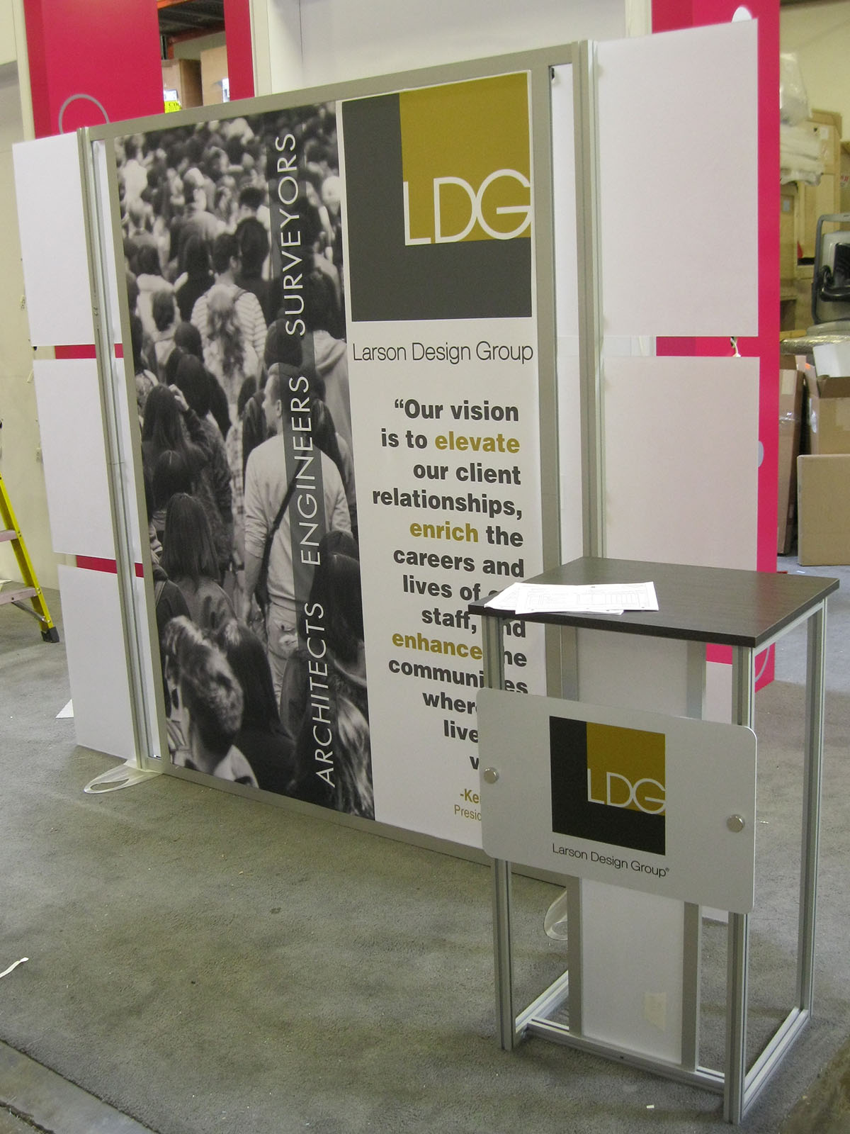 ecoSmart ECO-1049 and ECO-26C Pedestal, with Recycled Aluminum Extrusion Frame, ECO-Glass Stand Off Accents, Tension Fabric Graphic, ECO-Board Direct Print Stand Off Graphic