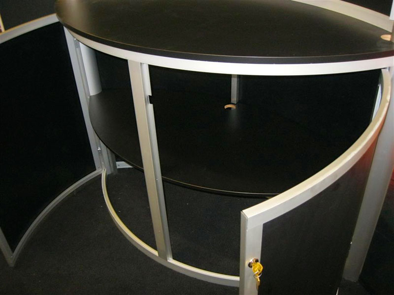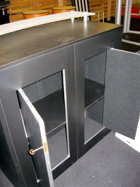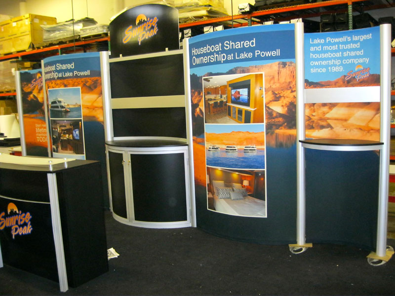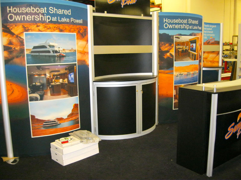 Modified ECO-2056 (ECO-1056) Sustainable Display with Shelves, Large Format Fabric Graphics, Aluminum Extrusion Frame, and (2) ECO-31C Counters with Locking Storage ECO-1056 Sustainable Display (2) ECO-31C Counters with Locking Storage (2) ECO-31C Counters with Locking Storage