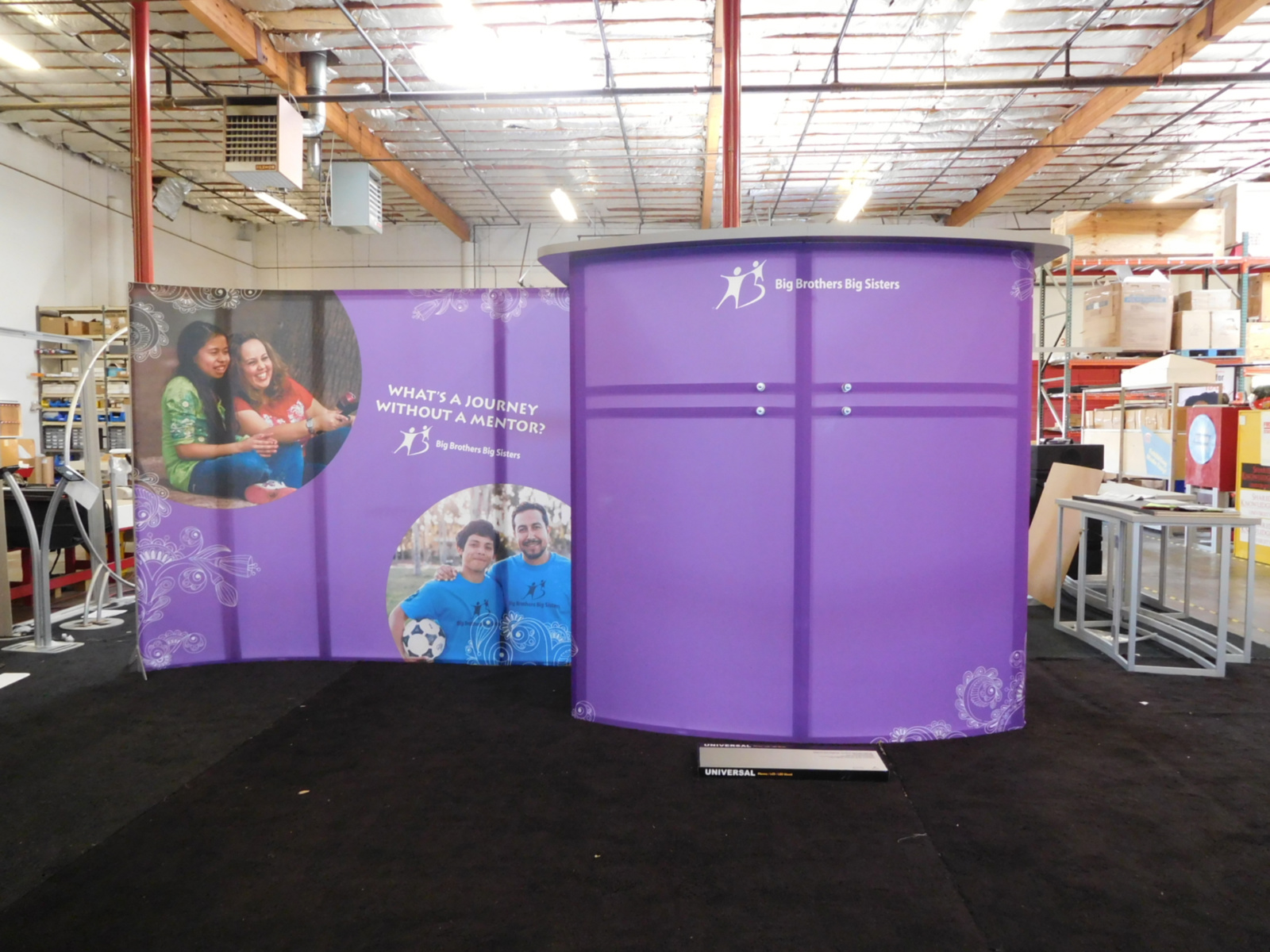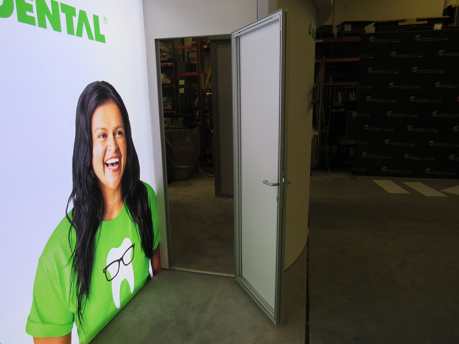 RENTAL: RE-2042 Gravitee One-Step System Panels, Includes Storage Closet with Locking Door, White Laminated Ceiling Soffit with, Large Monitor Mount, (3) Arm Lights, Silicone Edge Fabric Graphics, Sintra Door Graphic, and RE-702 Charging Station with Vinyl Graphic