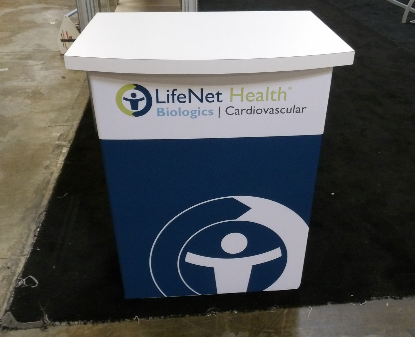 Custom Inline Exhibit with SEG Fabric Frames, Large Monitor Mount, Backwall Counter, GOD-1559 Counter with Storage, and (3) LED Stem Lights Custom Inline Exhibit with SEG Fabric Frames -- View 2