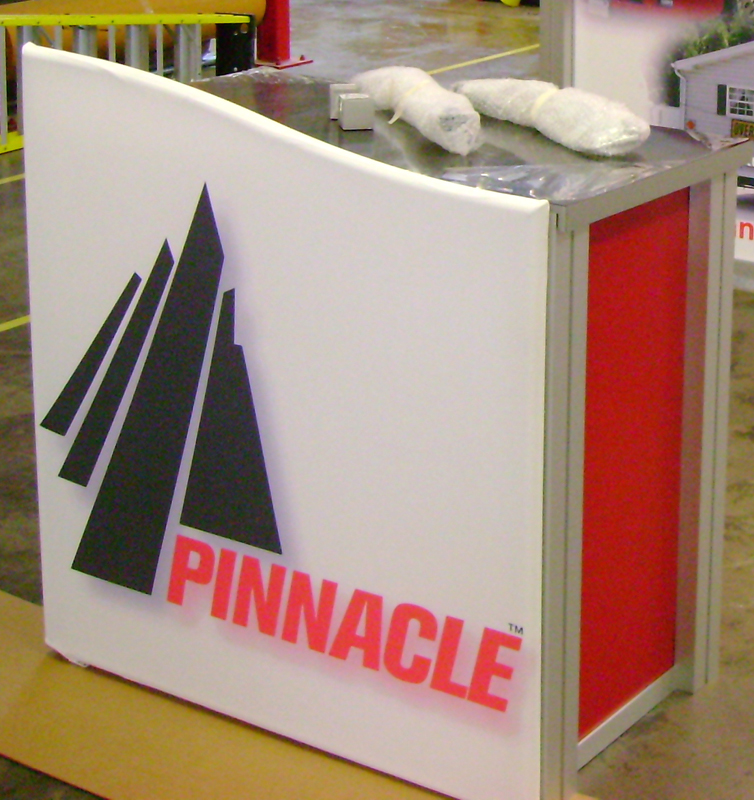 10' x 10' Visionary Designs VK-1008 Trade Show Exhibit with Alcove Counter MOD-1127 Pedestal with an Aero Tension Fabric Front