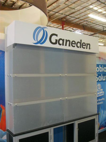 Modified eSmart ECO-2064 with Recycled Aluminum Extrusion Frame, Eco-glass Accent Wings, LED Lights, and Storage Bases. Includes Divider Walls with Graphic Infill, Eco-glass for Center Shelving, Literature racks, and Modified MOD-1175 Counter [44200]