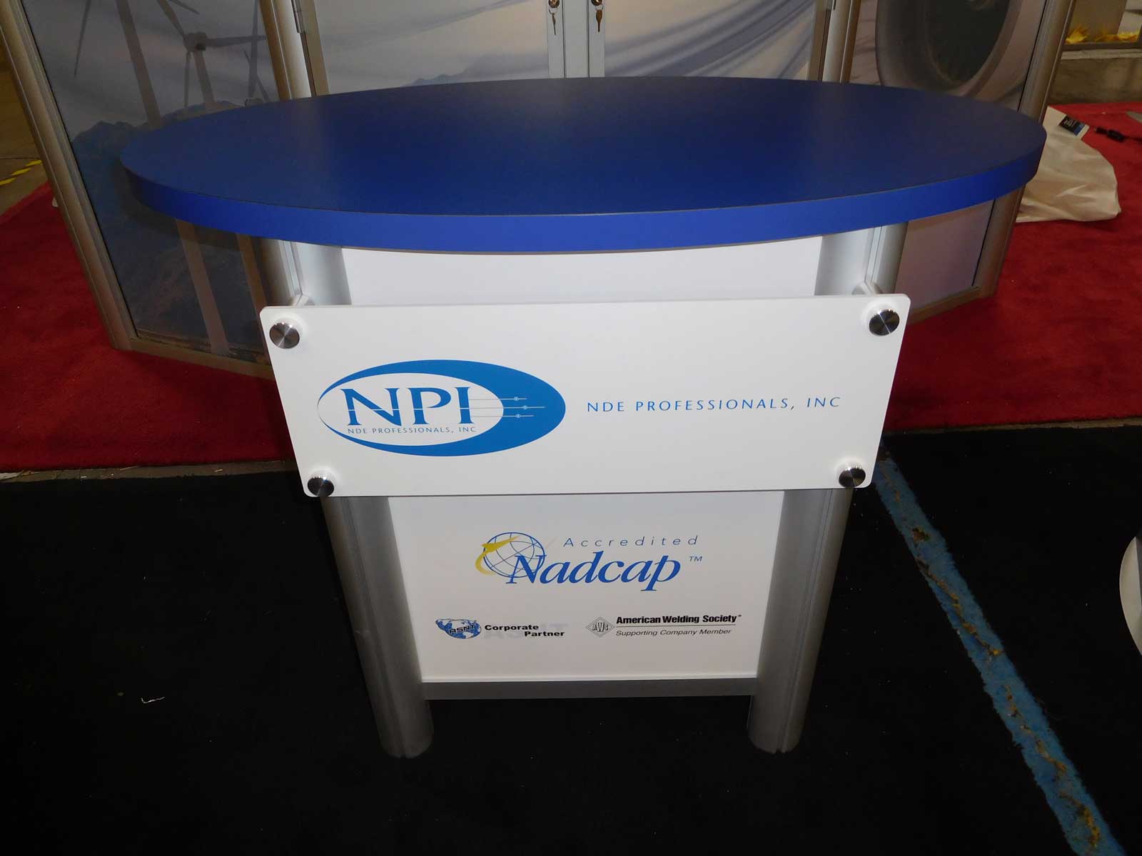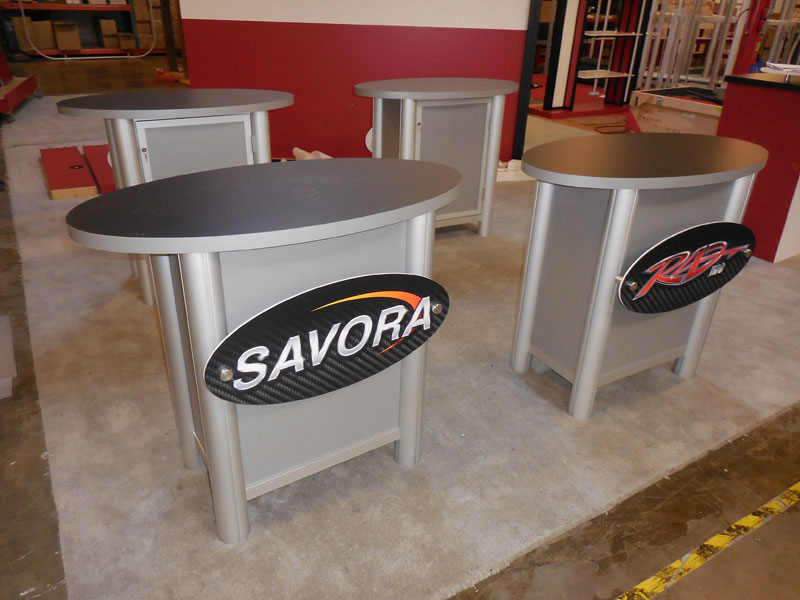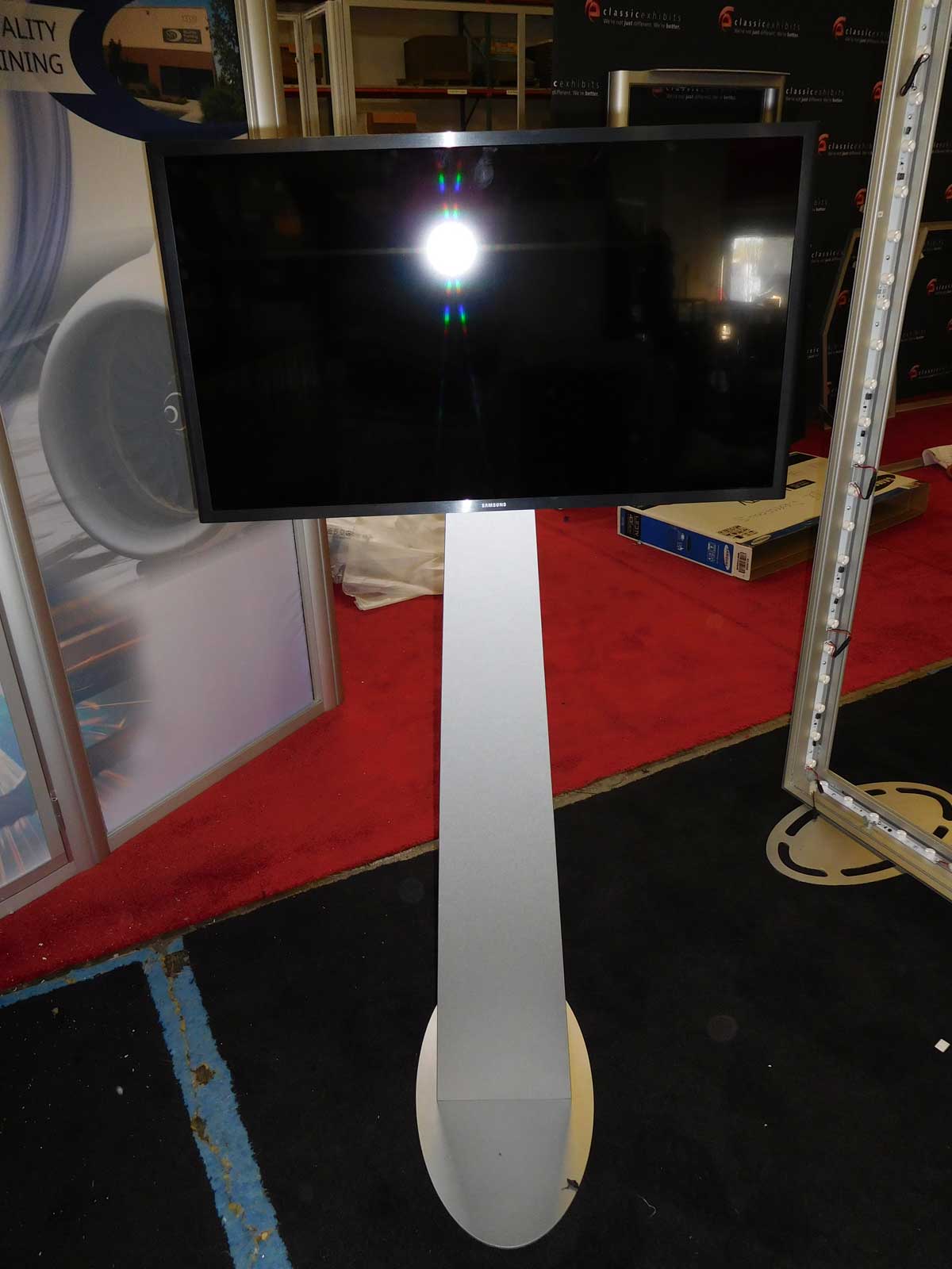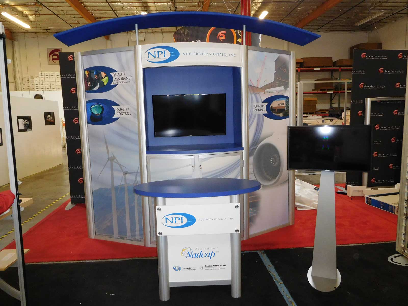 VK-1053 Visionary Designs Hybrid Exhibit Backwall Storage and Fabric Canopy MOD-1266 Modular Pedestal with Graphics LTK-1102 Monitor Kiosk Stand