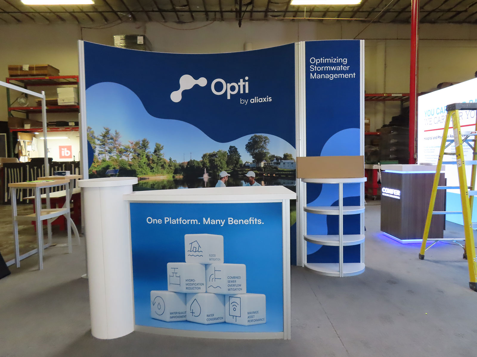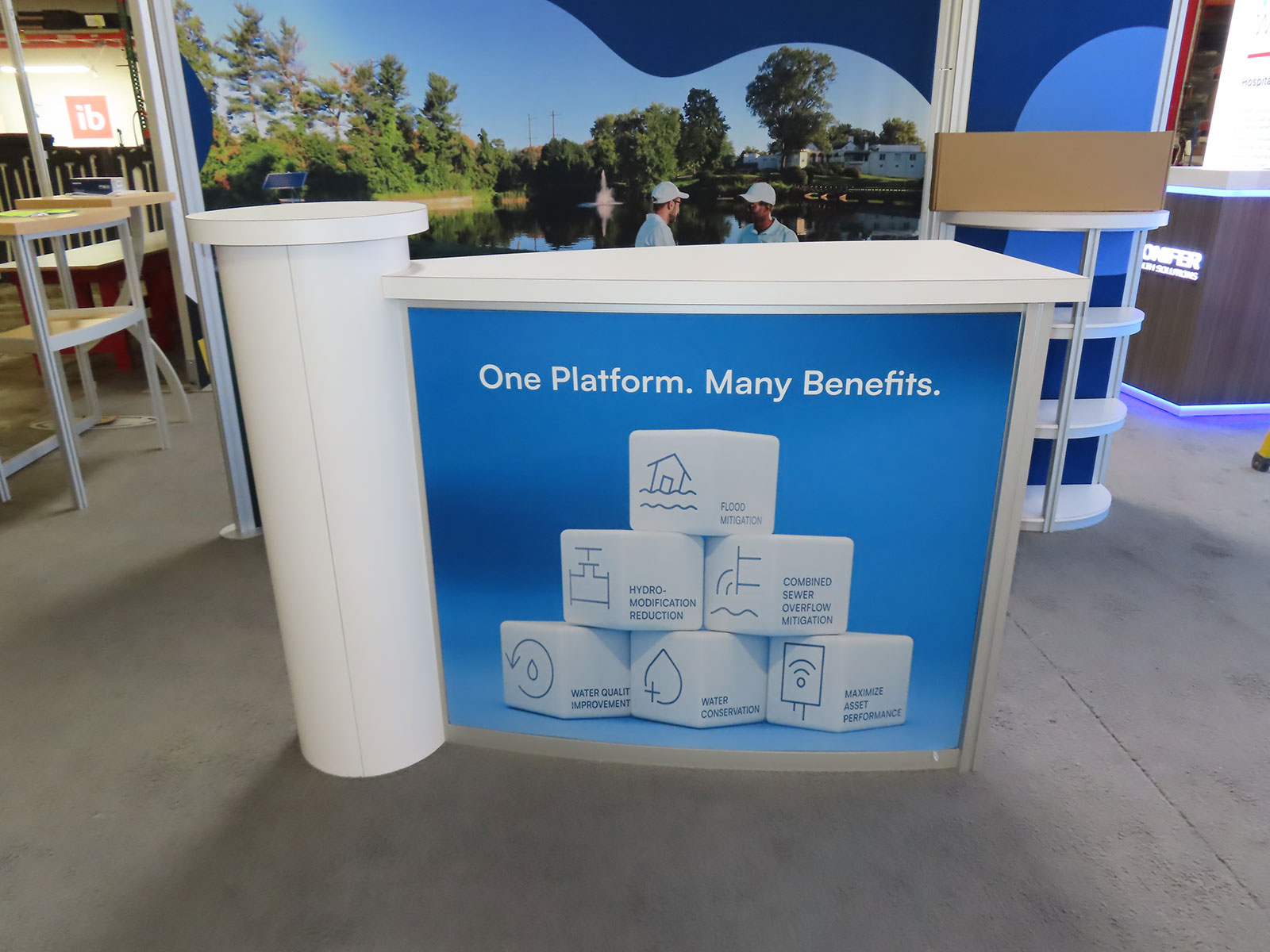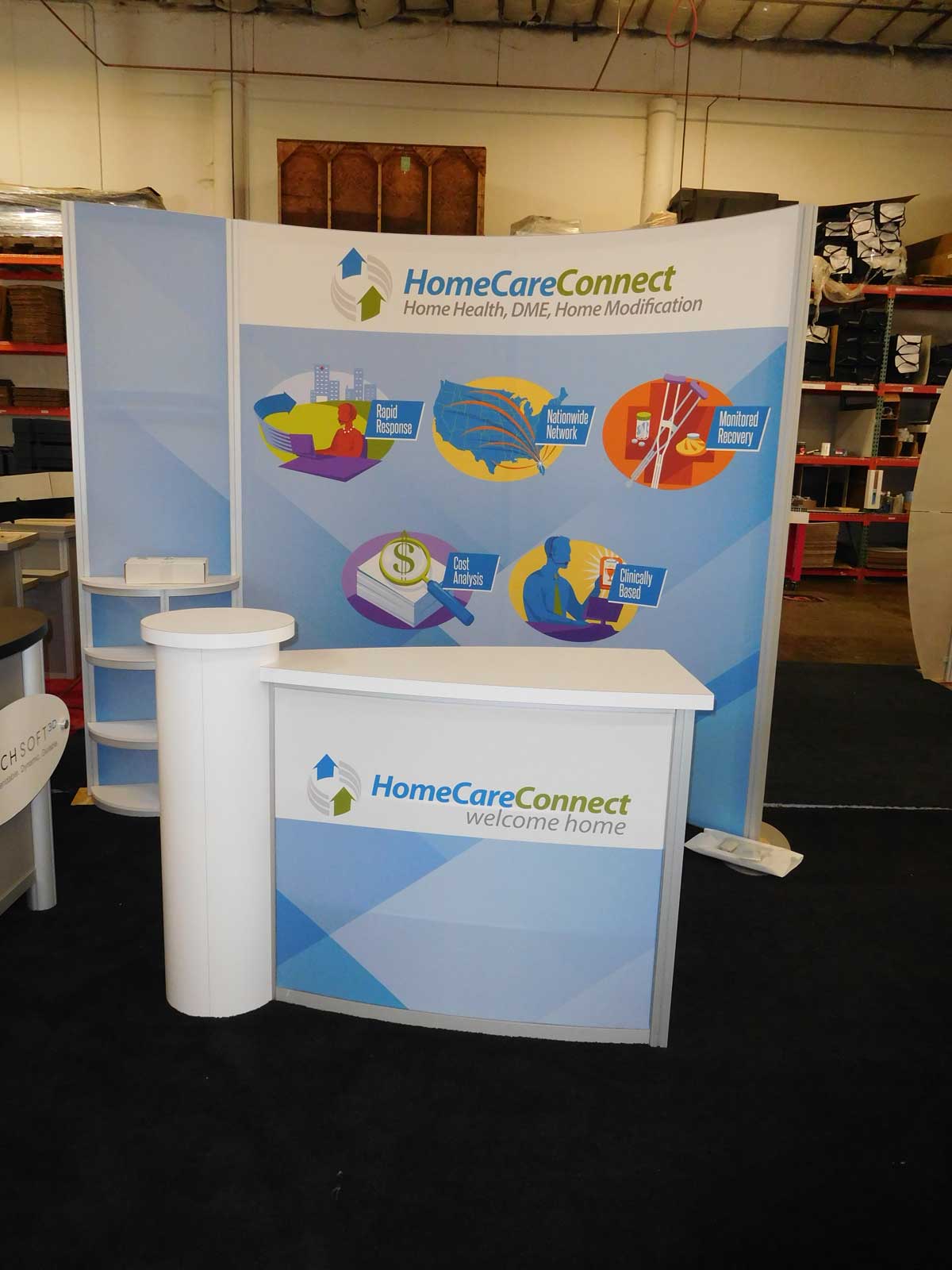 Modified VK-1323 Hybrid Exhibit with Tension Fabric and Direct Print Graphics, MOD-1289 Curved Counter with Shelves, Monitor Mount, and Workstation with Shelves [ORD-66488]