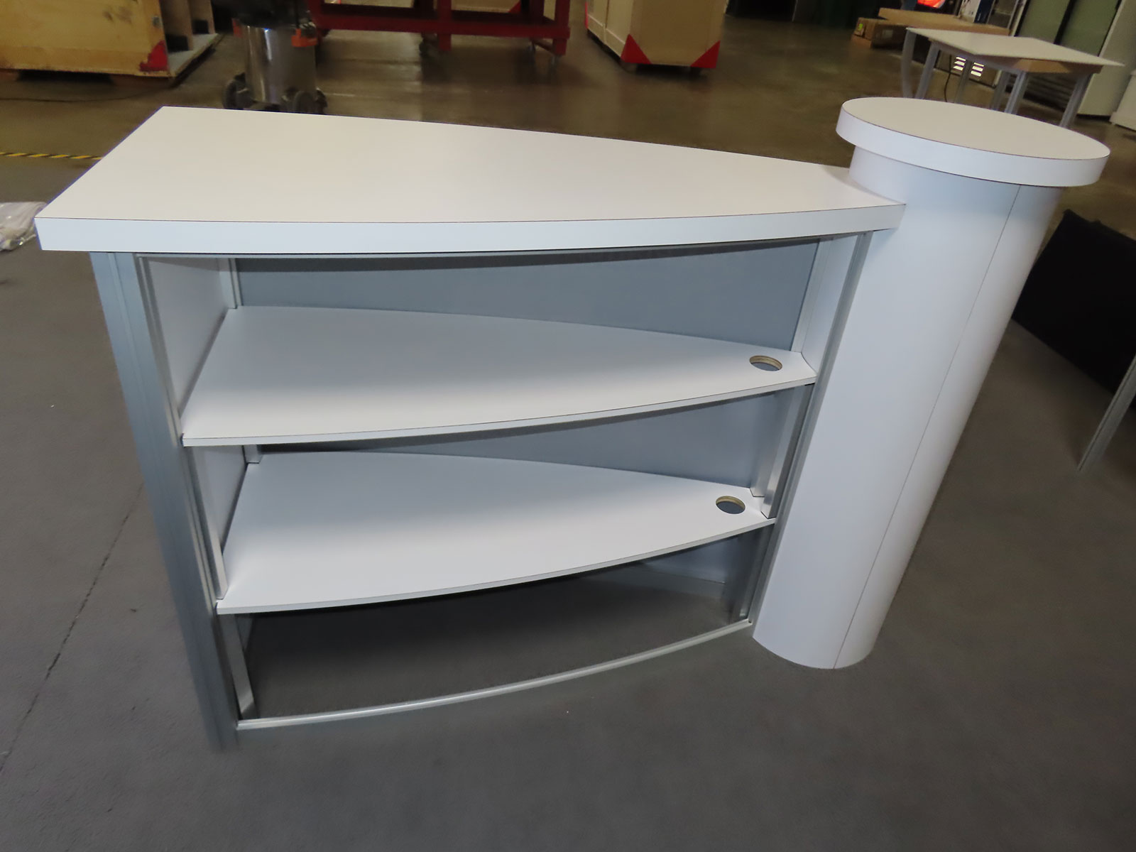 Modified VK-1323 Hybrid Exhibit with Tension Fabric and Direct Print Graphics, MOD-1289 Curved Counter with Shelves, Monitor Mount, and Workstation with Shelves MOD-1289 Curved Counter MOD-1289 Curved Counter -- Back View