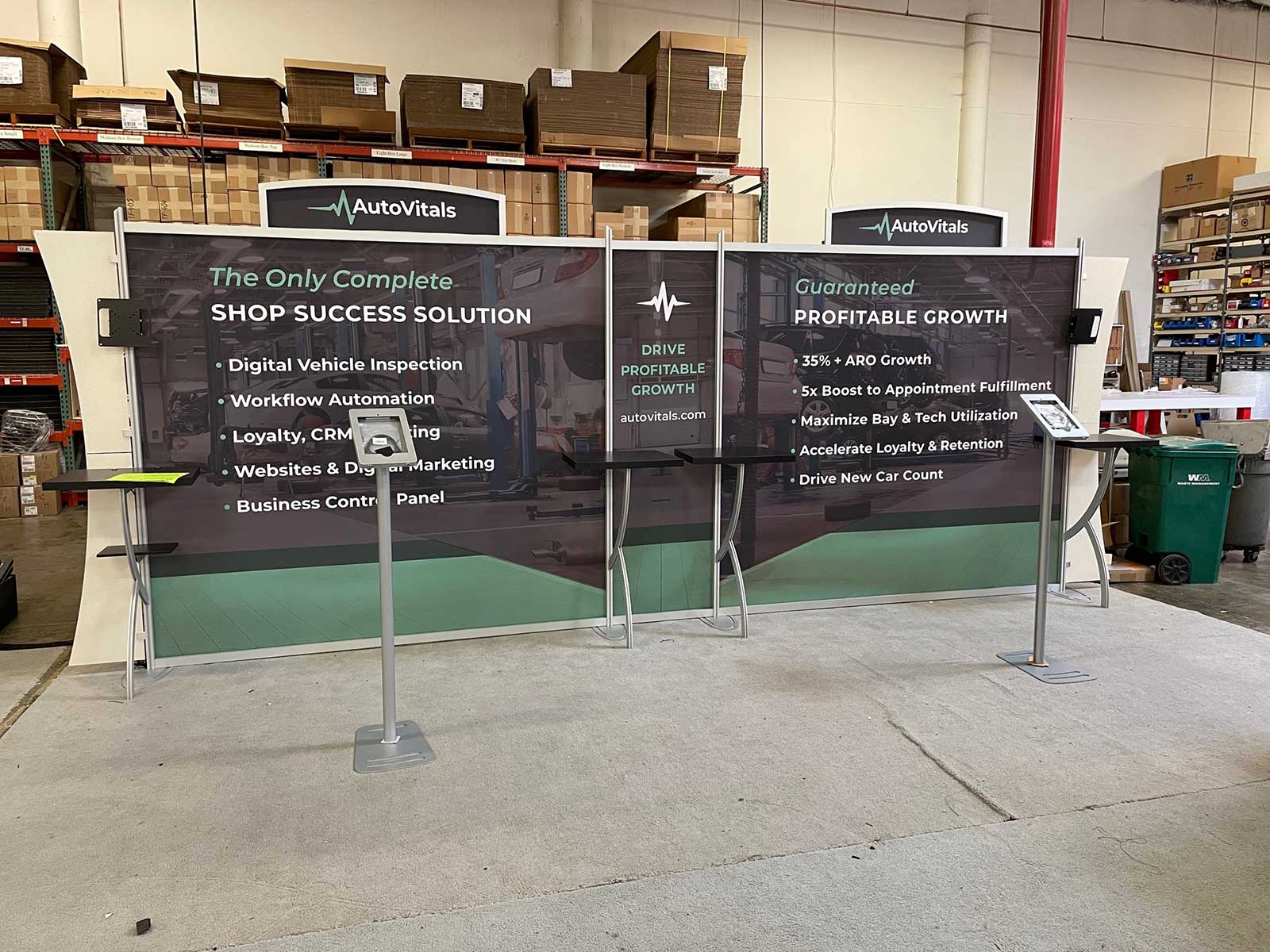 Sacagawea VK-2110 Portable Inline Display with Fabric Graphics, (4) Workstations, (2) Monitor Mounts, and (2) MOD-1335 iPad Tablet Stands with Locking Clamshells [57165]