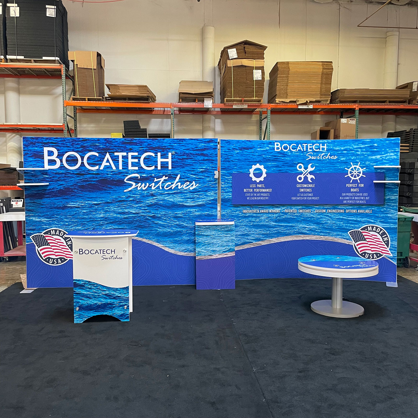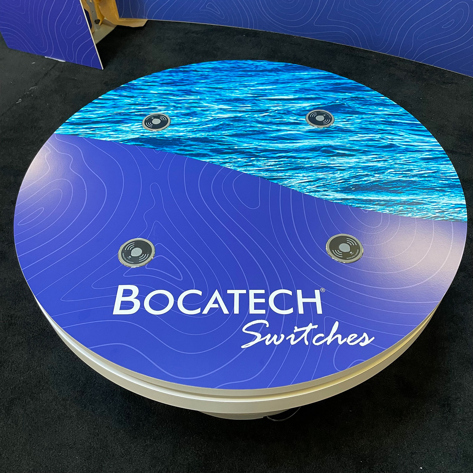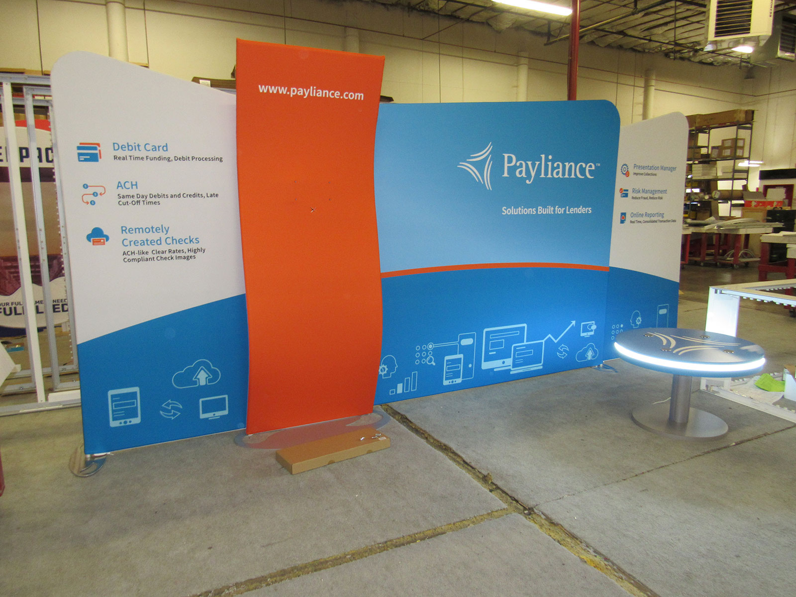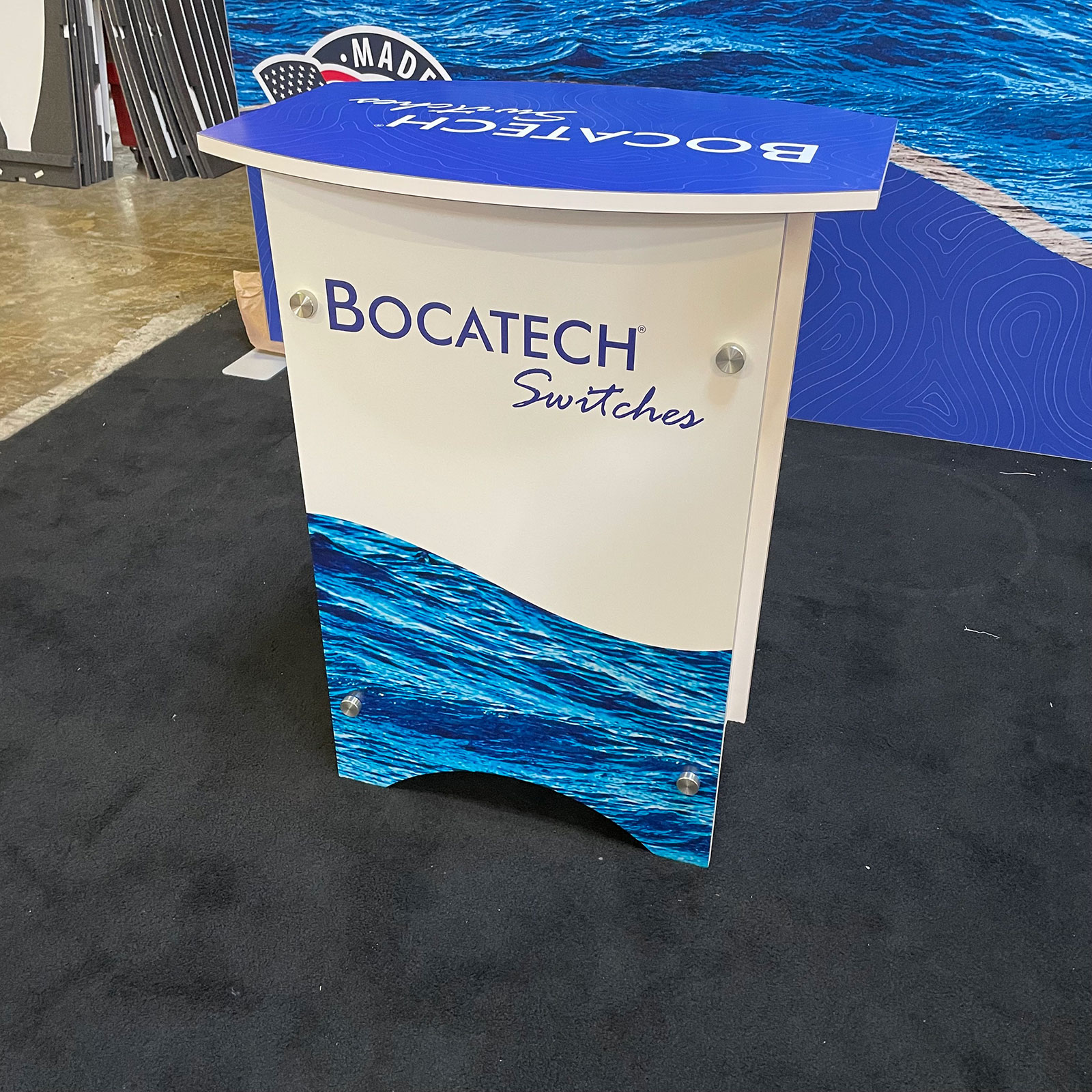 GK-2986 Gravitee Lightbox with Tension Fabric Graphics, MOD-1452 Charging Table with Wired/Wireless Charging, Custom Counter with Locking Storage, and MOD-1329 iPad Swivel Stand [57627]