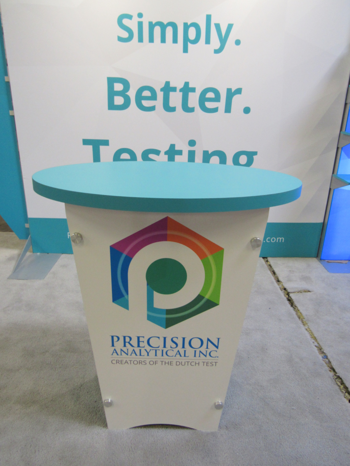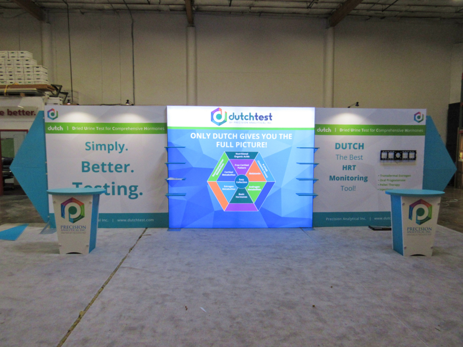 Double-sided LED Lightbox Backwall with SEG Fabric Graphics Modular Tapered Counter with Storage