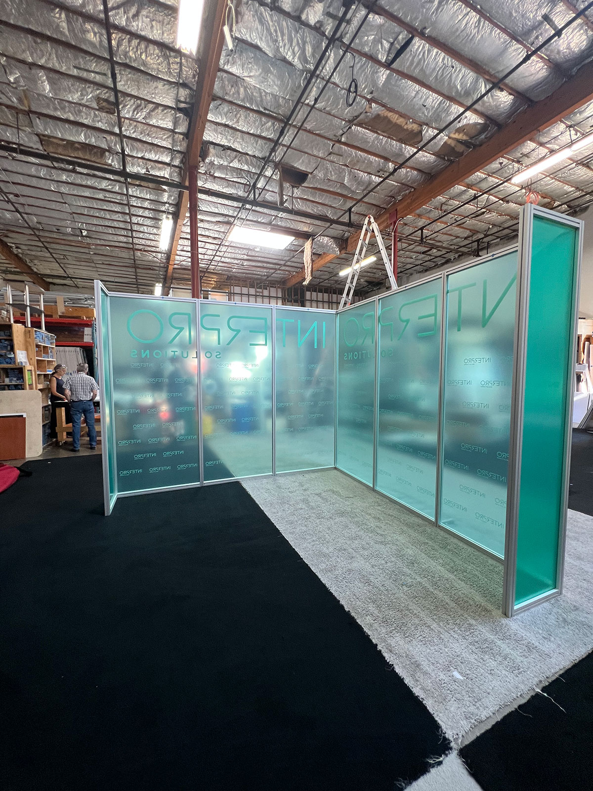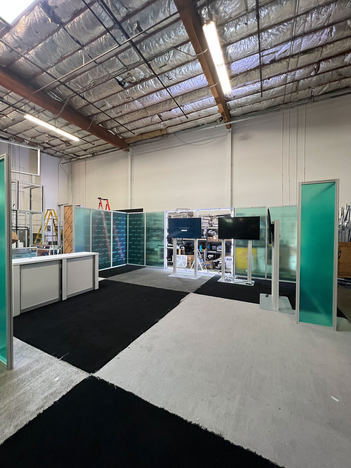 RENTAL: 40 x 55 Island Design with Connected Double-Sided Center Lightboxes @ 8 ft Wide x 16 ft High, (4) 8 ft Wide x 8 ft High Double-Sided Corner Lightboxes, (9) RE-1207 Large Rectangular Counters, Custom 3-Tier Product Demo Counters with White Laminate Finish, SEG Backlit Fabric Graphics. (NOTE: Green Protective Film on Counters)