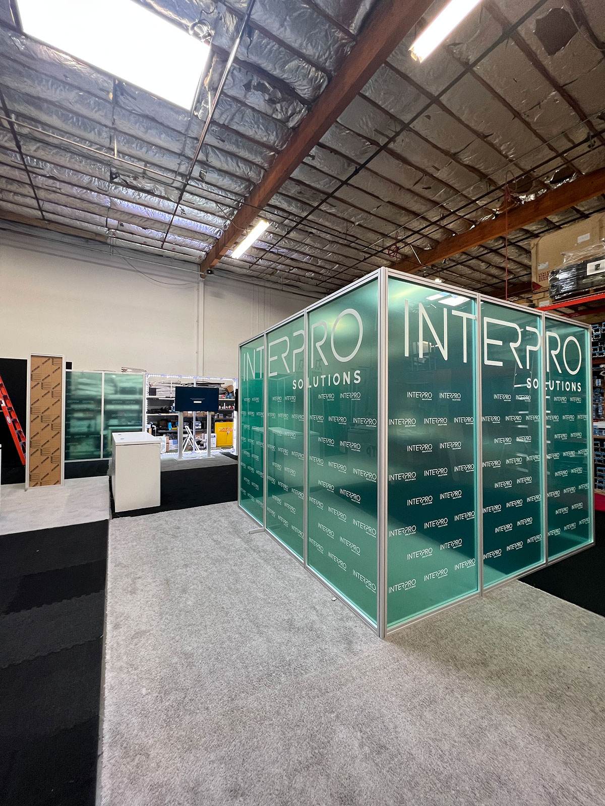 RENTAL: Island Design with Conference Room Structure @ 156" Wide x 118" Deep x 142.5" High with Gravitee System Panels and Other Extrusion Components, Framed Frosted Acrylic Window Infill Panels, Interior Door, Single-Sided Lightbox, Laminated Plant Shelv RENTAL: Island Design with Conference Room Structure @ 156" Wide x 118" Deep x 142.5" High with Gravitee System Panels and Other Extrusion Components -- View 2 RENTAL: Island Design with Conference Room Structure @ 156" Wide x 118" Deep x 142.5" High with Gravitee System Panels and Other Extrusion Components -- View 3 RENTAL: Island Design with Conference Room Structure @ 156" Wide x 118" Deep x 142.5" High with Gravitee System Panels and Other Extrusion Components -- View 4