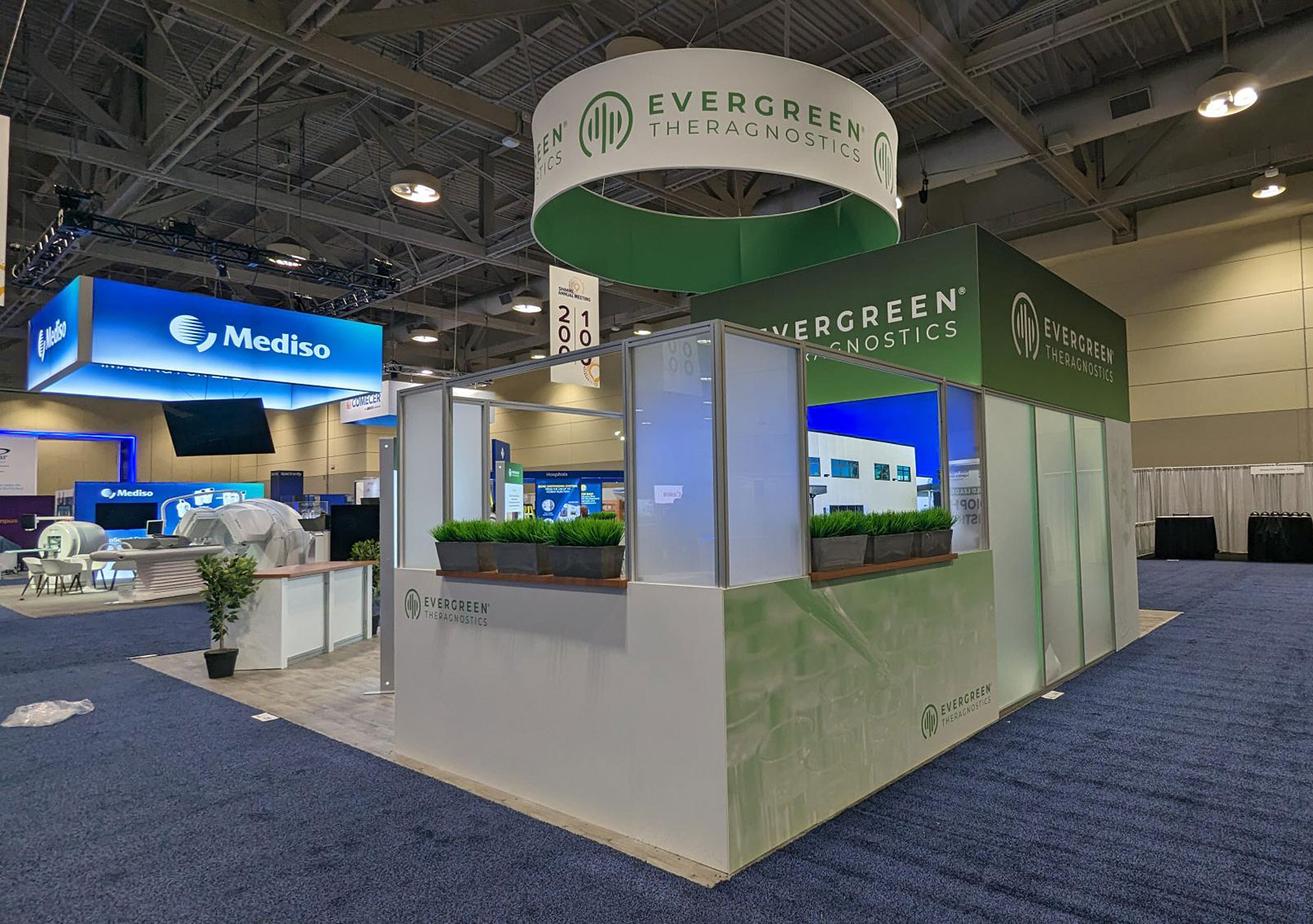 RENTAL: Island Design with Conference Room Structure @ 156" Wide x 118" Deep x 142.5" High with Gravitee System Panels and Other Extrusion Components, Framed Frosted Acrylic Window Infill Panels, Interior Door, Single-Sided Lightbox, Laminated Plant Shelves, Modified RE-1207 Reception Counter with Front Lightbox, Large Monitor Mount, 55" Monitor, L-Shaped Divider Wall with Plant Shelves, Refreshment Bar Inside Conference Room, SEG Fabric Graphics, and Direct Print Sintra Graphics
