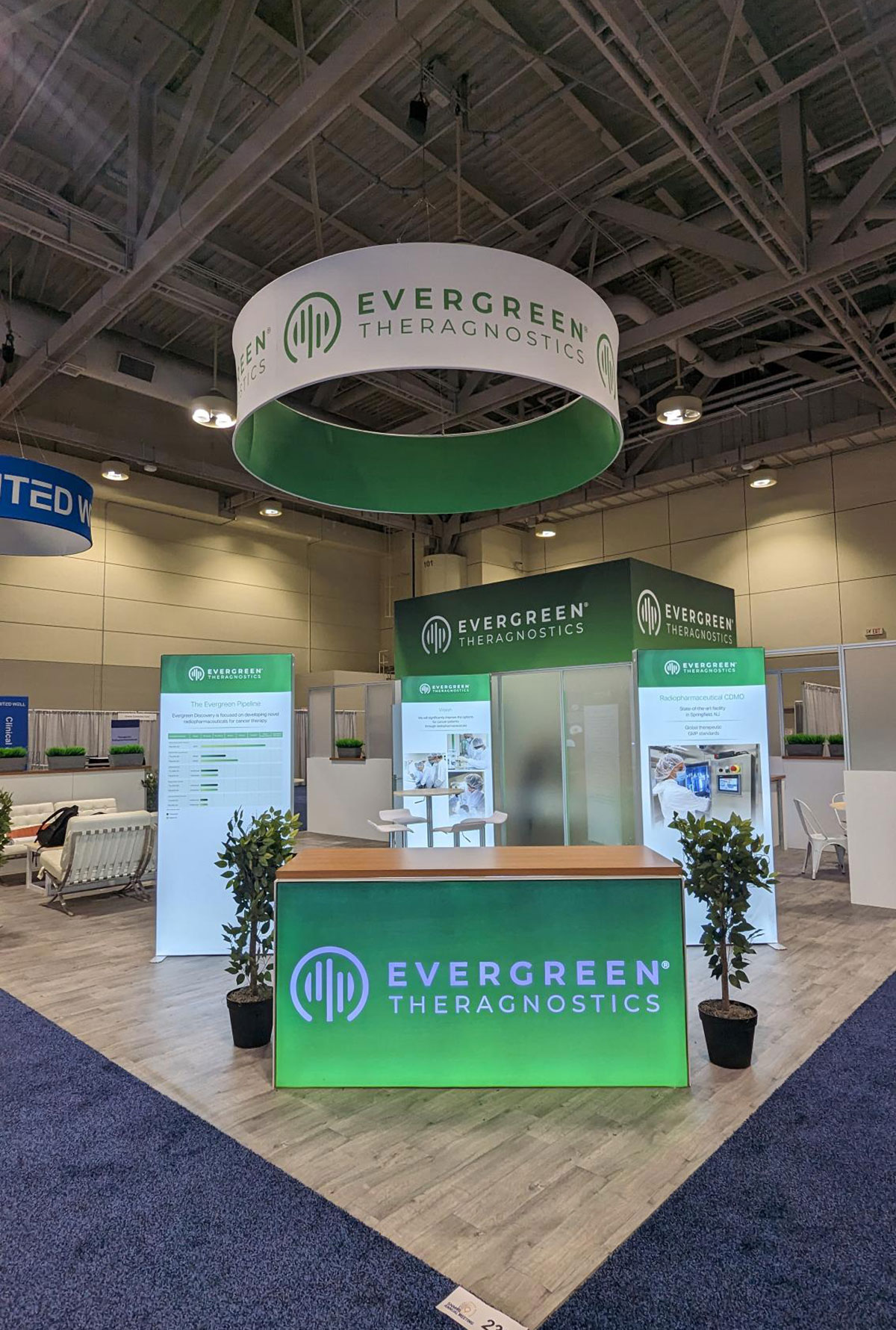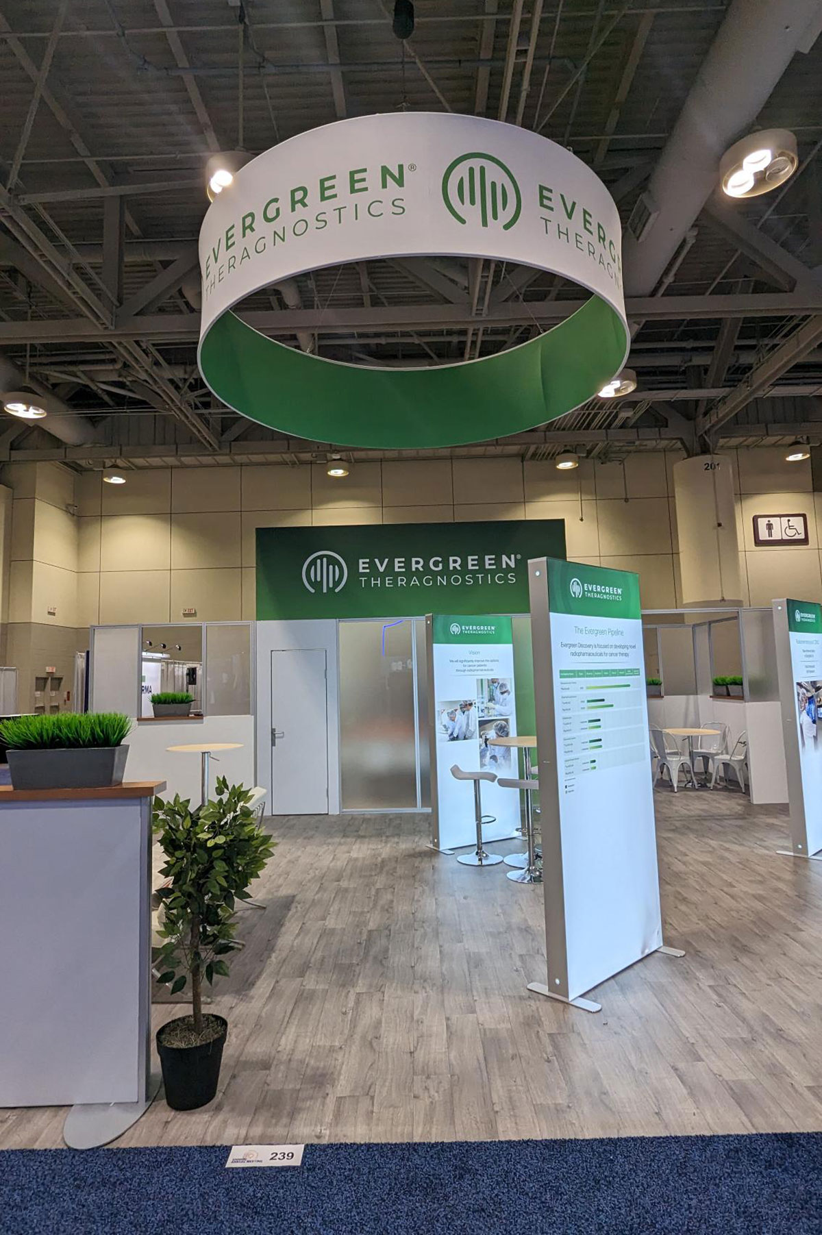 RENTAL: Modified RE-9120 Island Design with Curved Gravitee System Tower, Curved Extrusion Header, Semi-Private Meeting Area with Clear Acrylic Panels, RE-1207 Large Rectangular Counter, (2) Workstation Kiosks with RE-1221 Counters, RE-1250 Reception Counter, (3) Monitor Mounts, SEG Fabric Graphics, and Direct Print Sintra Graphics.