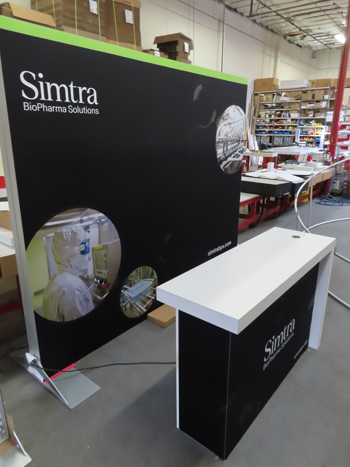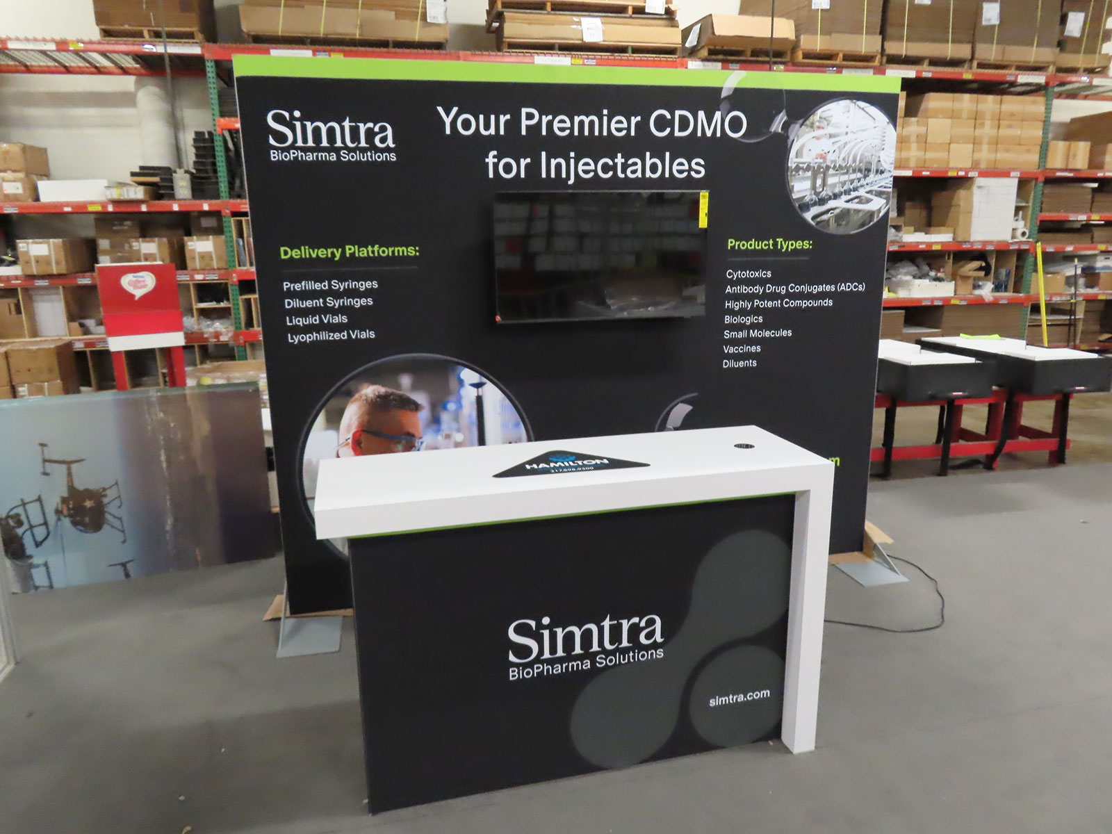 Modifed VK-1357 Backlit Exhibit with Tension Fabric Graphics, Monitor Mount, and MOD-1716 Reception Counter with Backlit Graphics and Locking Storage [ORD-67345]
