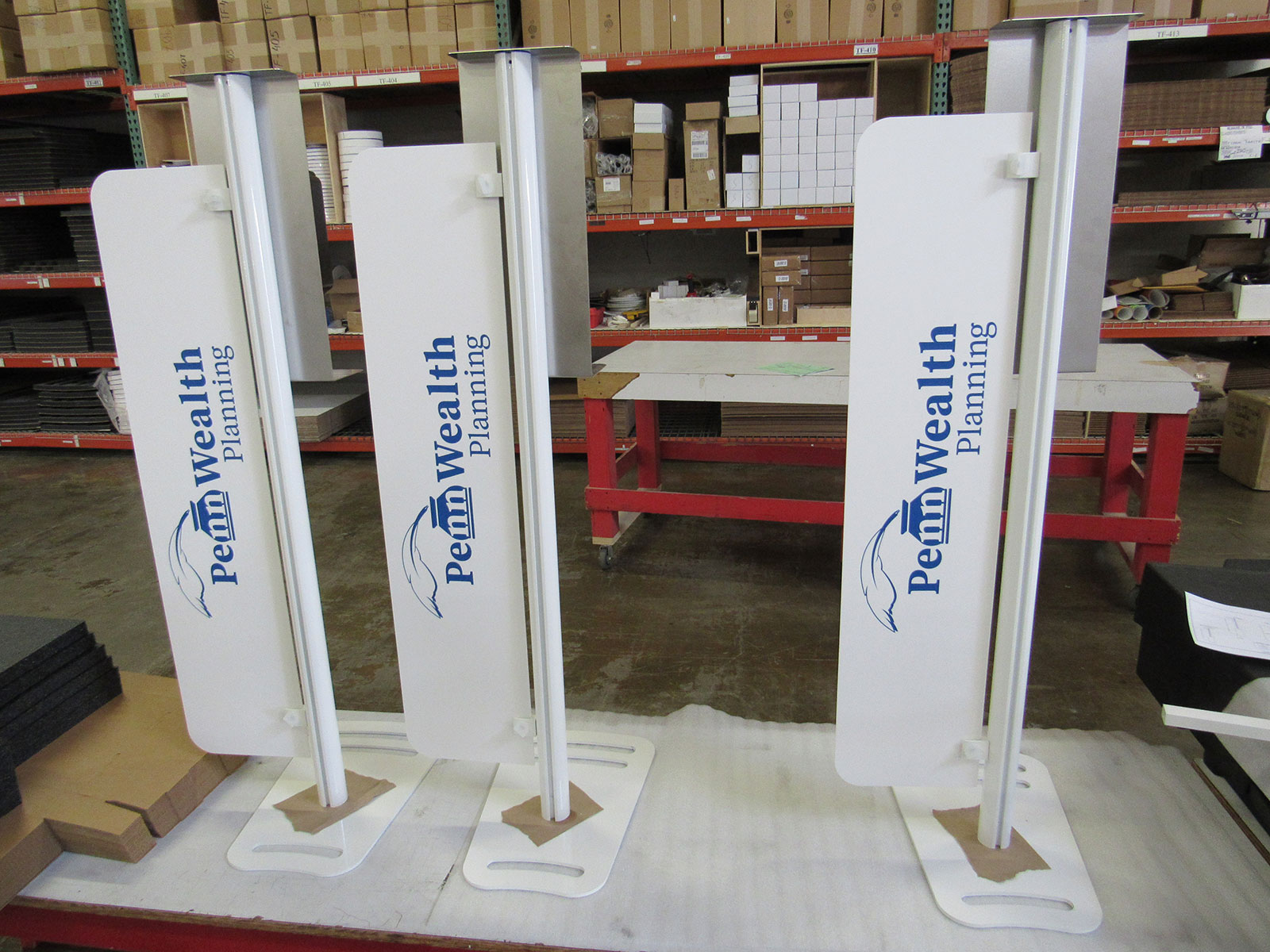 (3) MOD-9001 Hand Sanitizer Stands with Wing Graphic, White Powder-coated Post and Base Plate, and Stainless Steel Mounting Plate (3) MOD-9001 Hand Sanitizer Stands with Wing Graphic, White Powder-coated Post and Base Plate, and Stainless Steel Mounting Plate