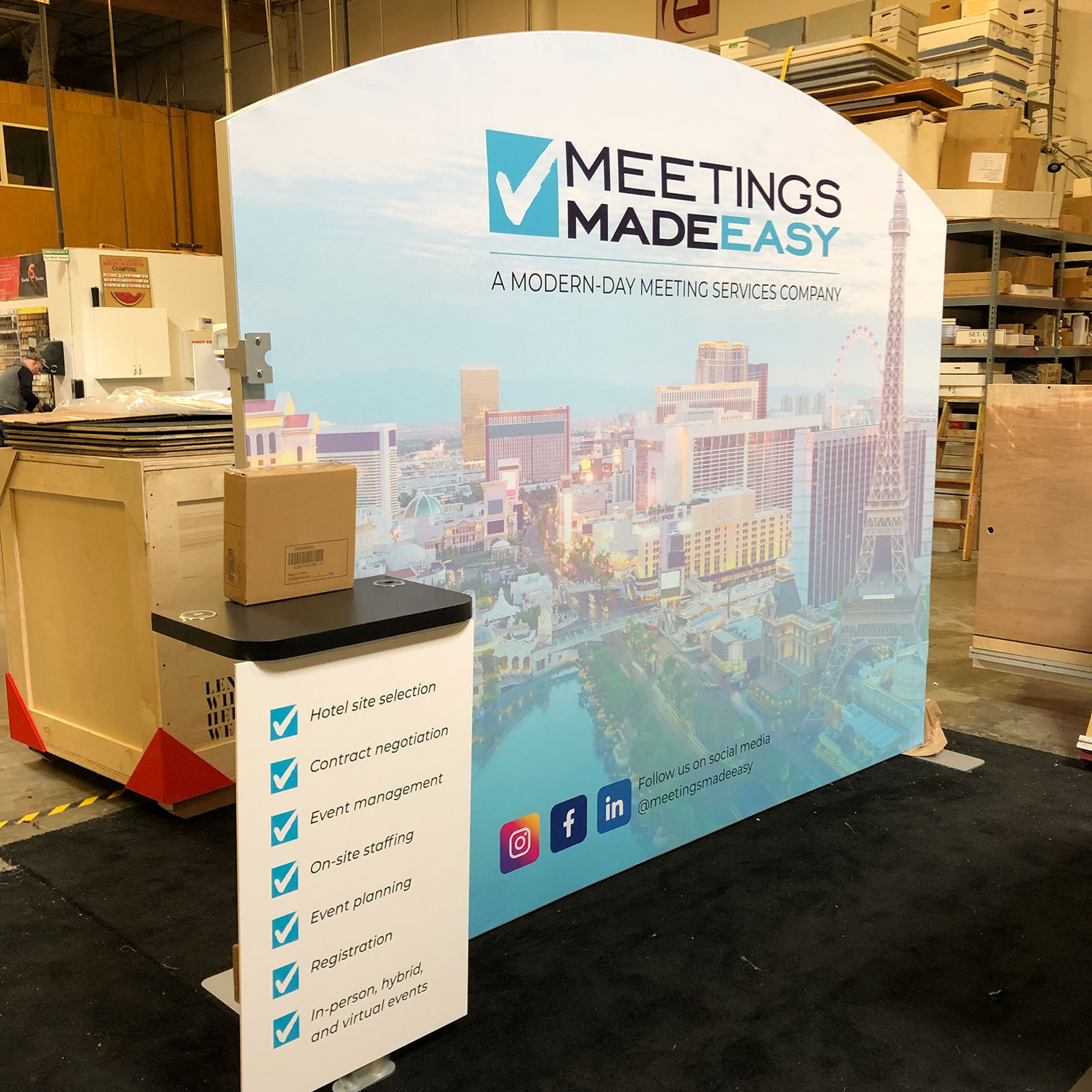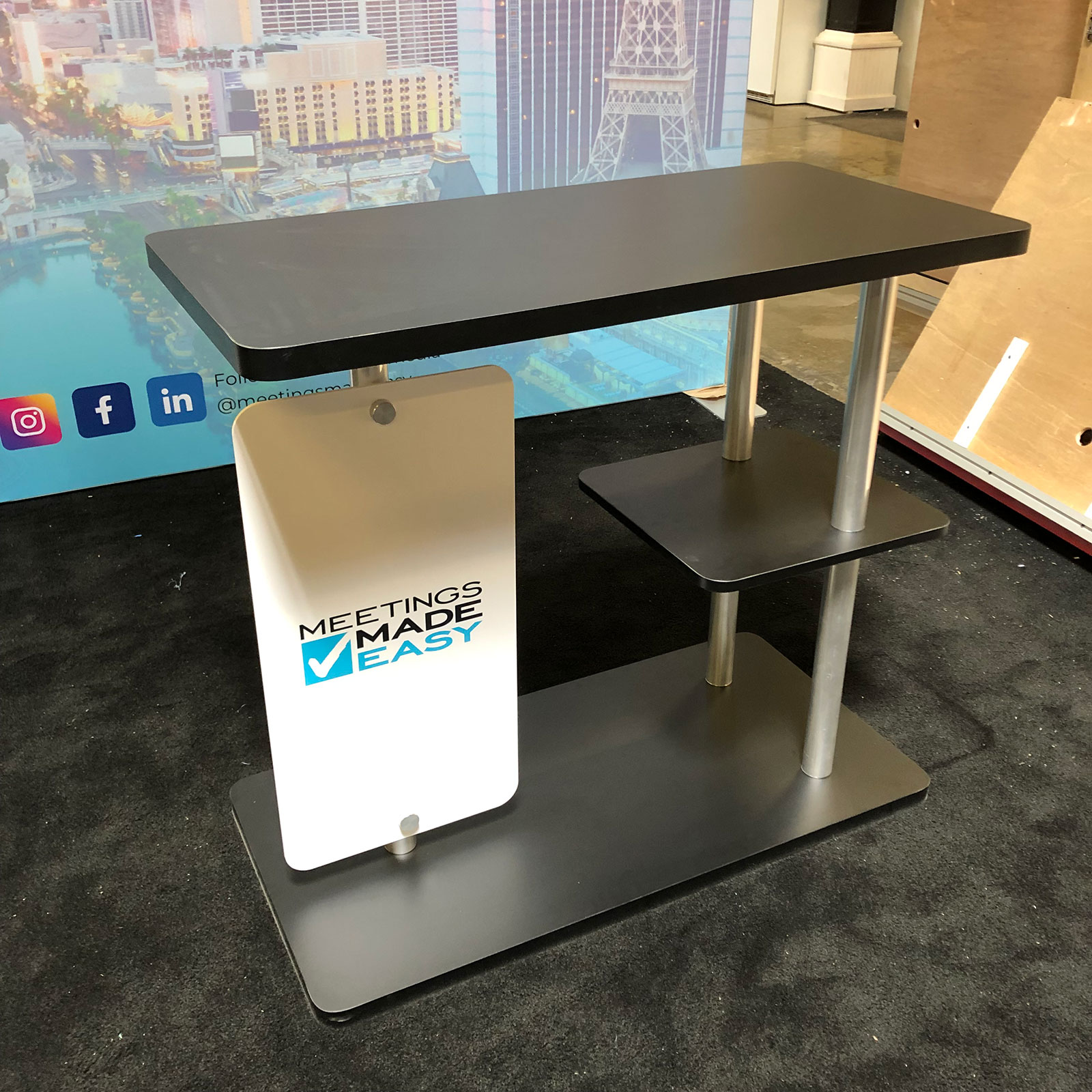 SYK-1006 Symphony Portable Display with SEG Fabric Graphics, Workstation with Wireless Charging, Monitor Mount, Stem Lights, and SYM-404 Open Reception Counter [58482]