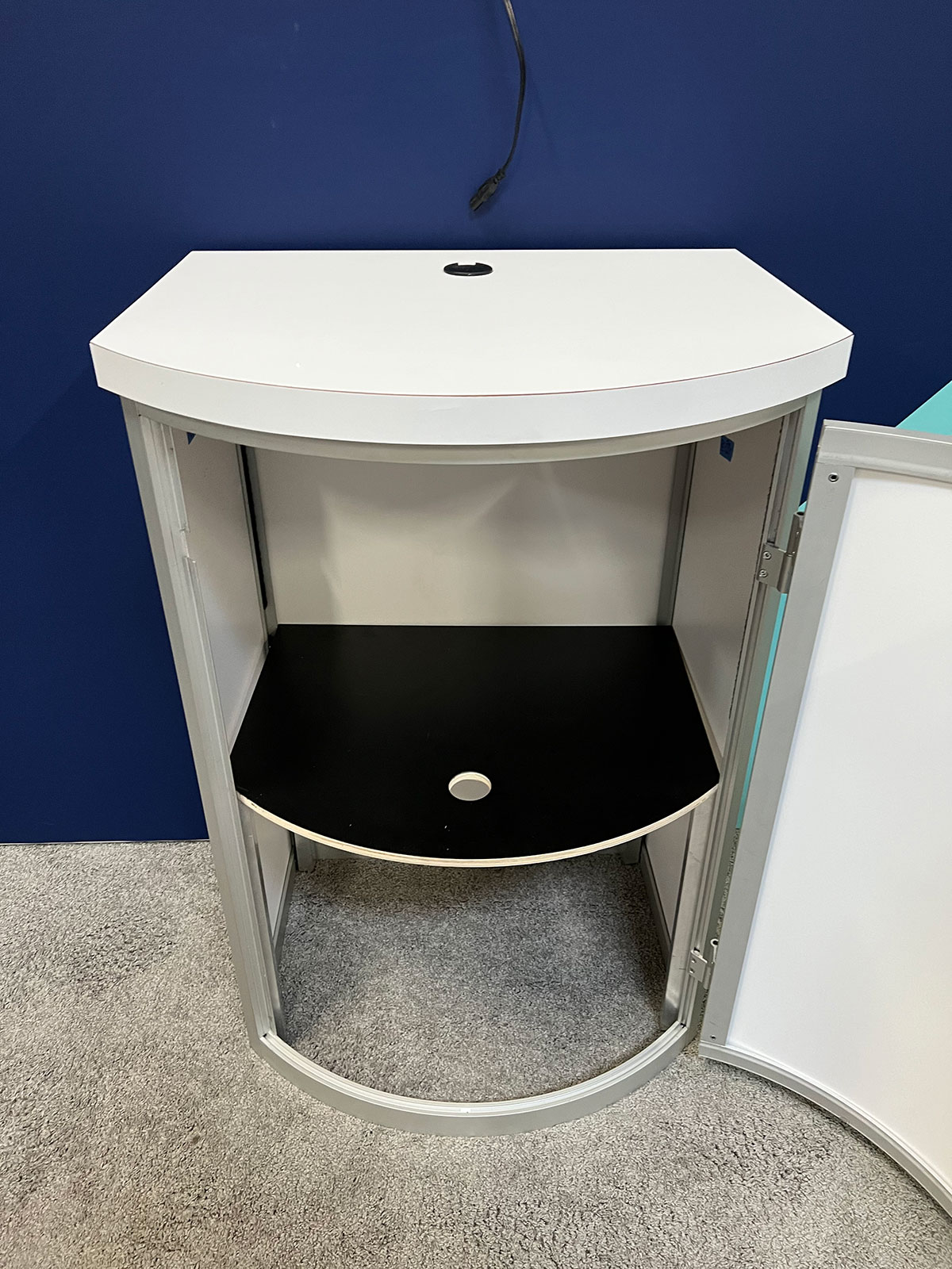 VK-1972 SEGUE Inline Display with Tension Fabric Graphic, MOD-1700c Reception Counter with Charging Pad, and MOD-1333 iPad Tablet Stand VK-1972 SEGUE Inline Display with Tension Fabric Graphic, MOD-1700c Reception Counter with Charging Pad, and MOD-1333 iPad Tablet Stand