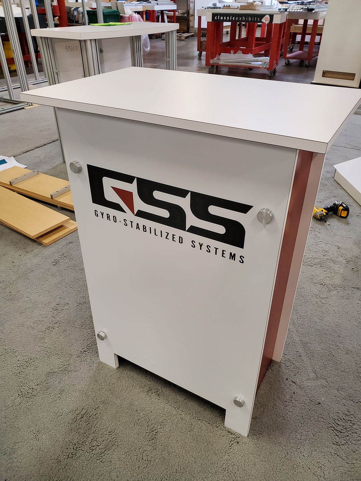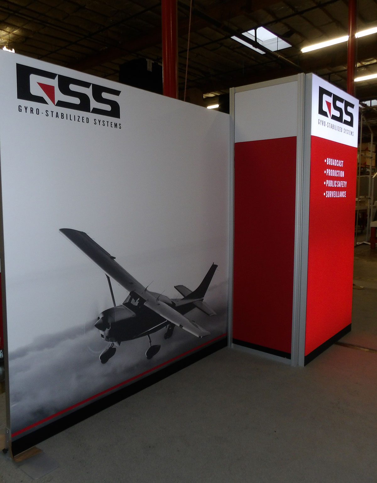Modified (2) SYK-1034 Symphony Displays with SEG Fabric Graphics, (1) Backlit Closet with Door, and SYM-407 Portable Pedestal with Locking Storage Modified Inline Exhibit -- View 2 Modified Inline Exhibit -- View 3 SYM-407 Portable Counter