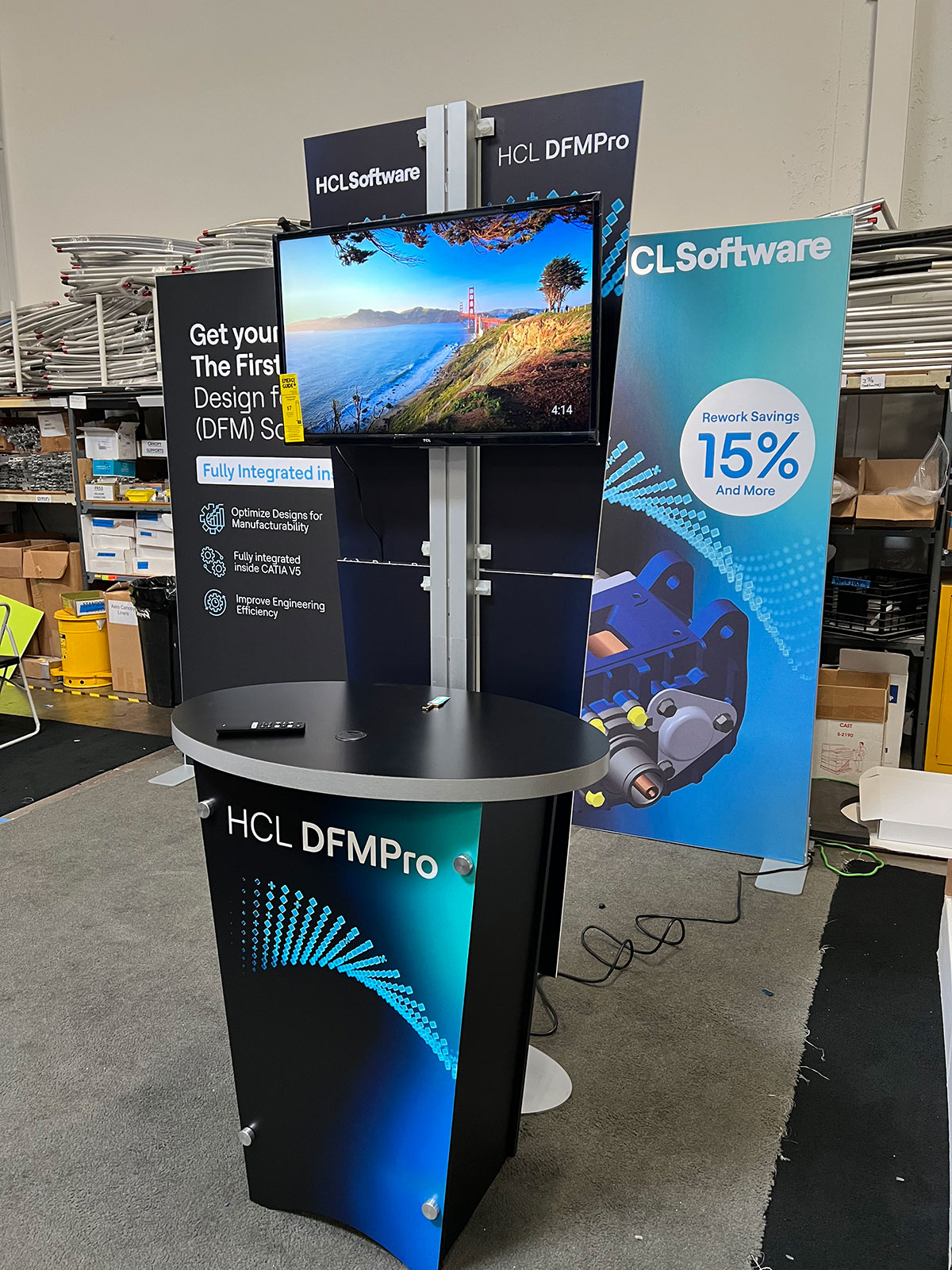 RENTAL: RE-1089 Inline Design with (2) LED Arm Lights, RE-1212 Kiosk with Monitor Mount, 32 inch Monitor, SEG Fabric Graphics, Direct Print Sintra Accent Wing Graphics, and Vinyl Applied Counter Graphic