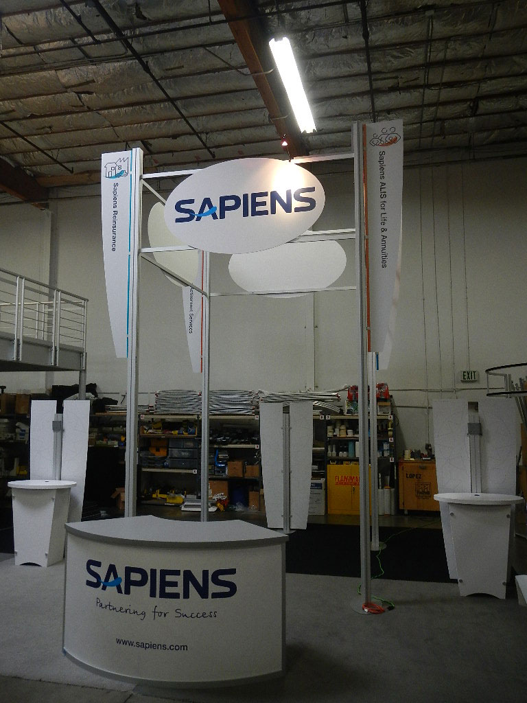 RENTAL: RE-1089 Inline Design with (2) LED Arm Lights, RE-1212 Kiosk with Monitor Mount, 32 inch Monitor, SEG Fabric Graphics, Direct Print Sintra Accent Wing Graphics, and Vinyl Applied Counter Graphic