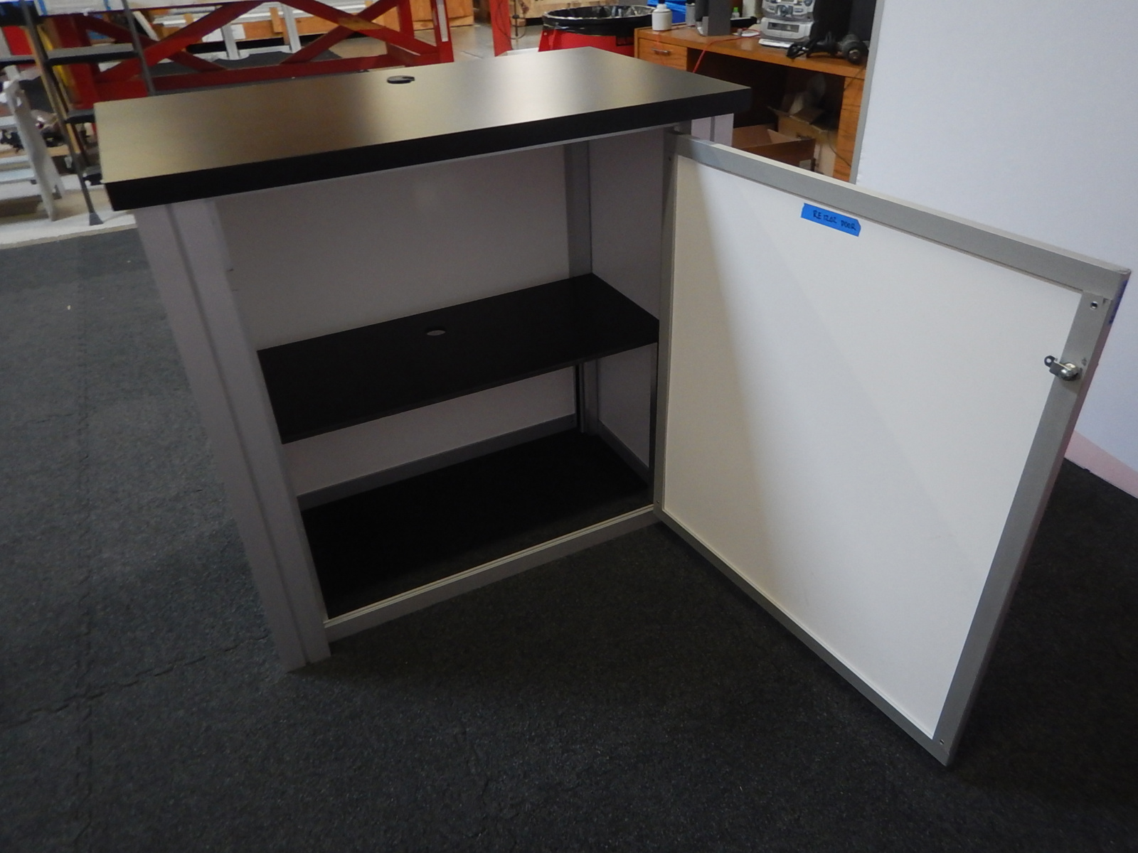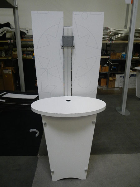 RENTAL: RE-1089 10 x 10 Inline Design with (2) LED Arm Lights, RE-1212 Kiosk with Monitor Mount, 32 inch Monitor, SEG Fabric Graphics, Direct Print Sintra Accent Wing Graphics, and Vinyl Applied Counter Graphic. RE-1212 Workstation RENTAL: RE-1089 -- Image 3 Locking Storage