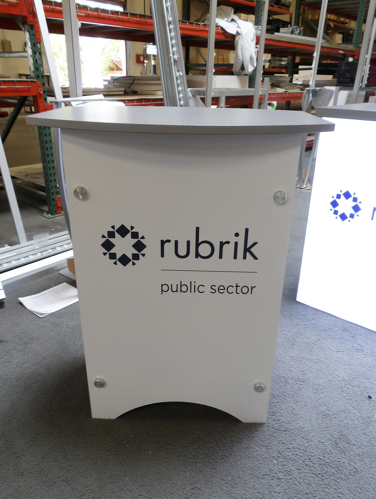 Reception Counter with White Laminated Top, SEG Backlit Fabric
