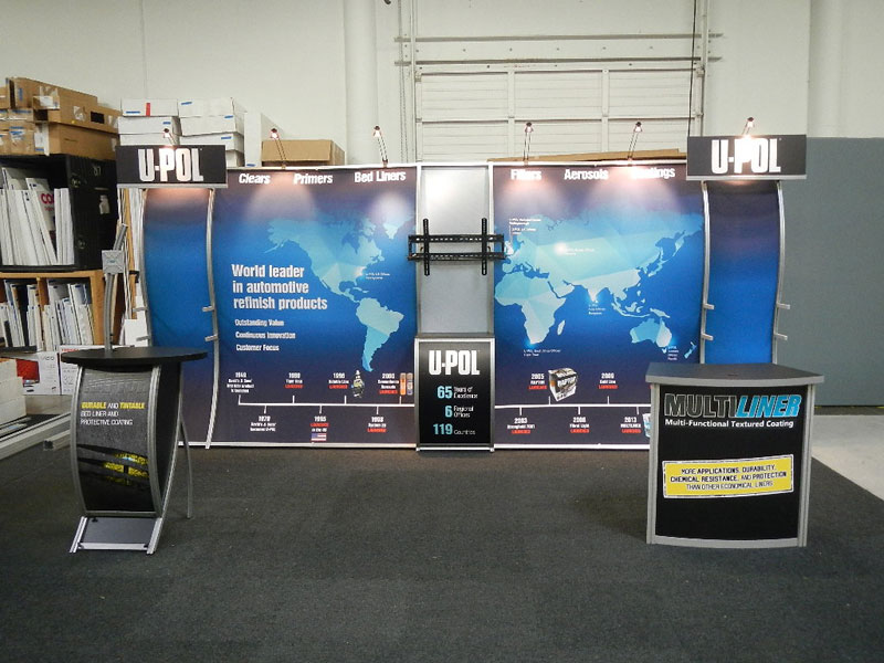 RENTAL: RE-2028 Perfect 20 Backwall with (6) Halogen Arm Lights, (1) Attached VK-1659 Counter, (1) RE-1213 Workstation Kiosk with Small Monitor Mount, (1) RE-1228 Small Curved Counter
