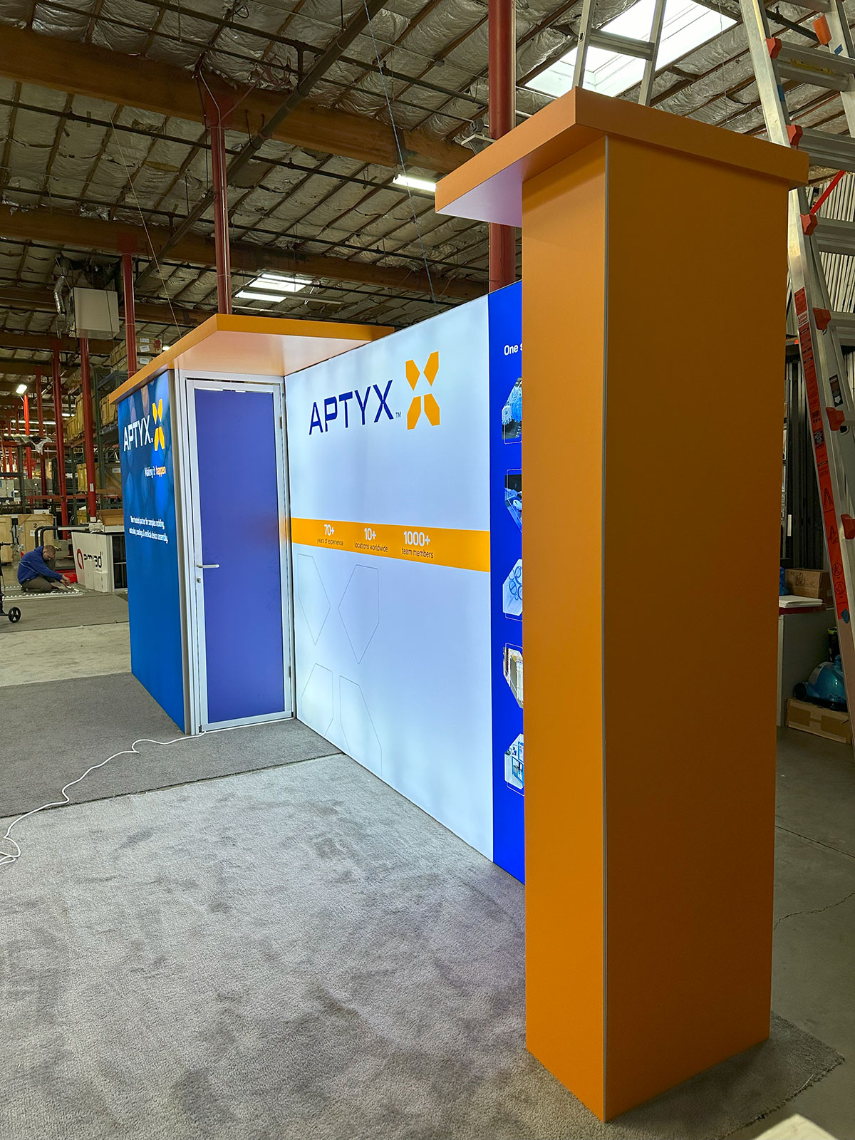 RENTAL: RE-2100 Inline Lightbox Design with Laminated Ceiling Soffits, Storage Closet with Locking Door, SEG Fabric Graphics, and Vinyl Applied Graphics