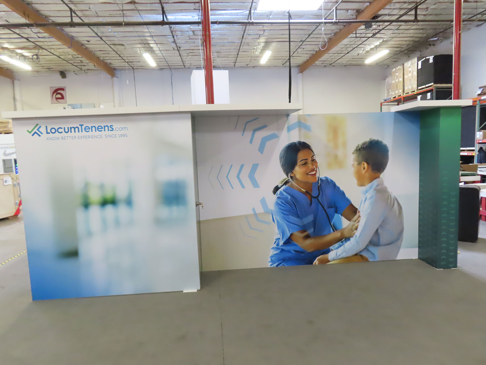 RENTAL: Modified RE-2100 Inline with Storage Closet with Locking Door, White Laminated Ceiling Soffits, (2) Lightboxes, RE-1221 Reception Counter, SEG Backlit Fabric Graphics, and Direct Print Sintra Counter Graphic