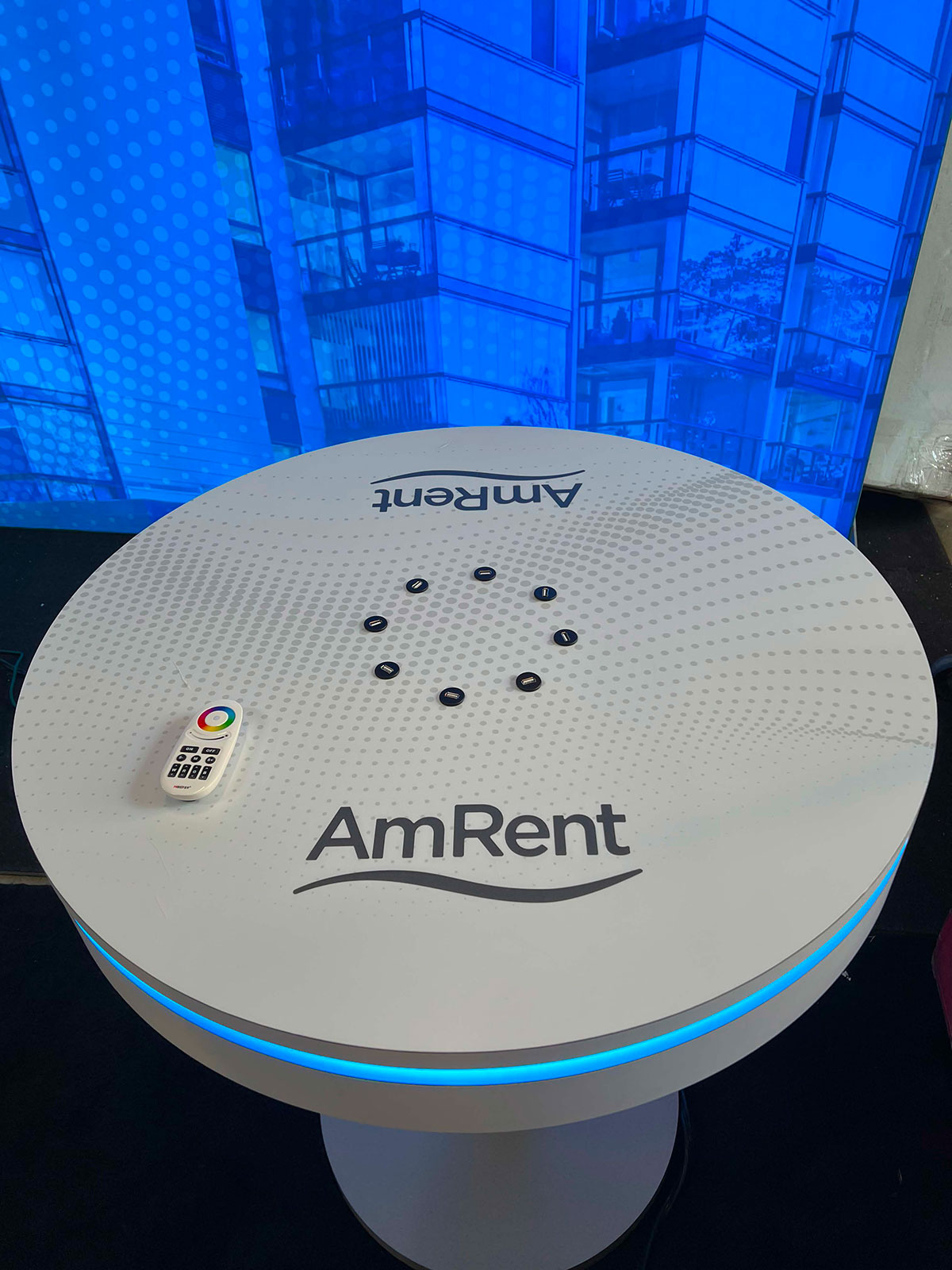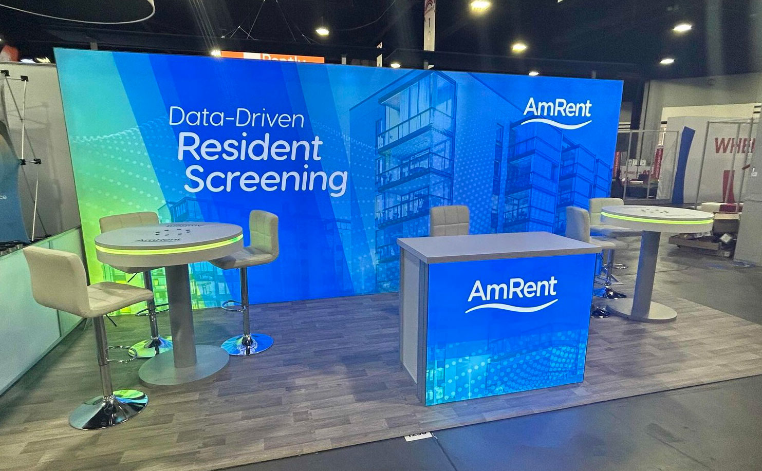 RENTAL: RE-2111 Inline Design with Single-Sided Lightbox with Flat Canopies with Black Pillowcase Fabric Covers, (2) RE-704 Charging Station Tables, RE-1567 Backlit Reception Counter, SEG Backlit Fabric Graphic, and Vinyl Applied Graphics