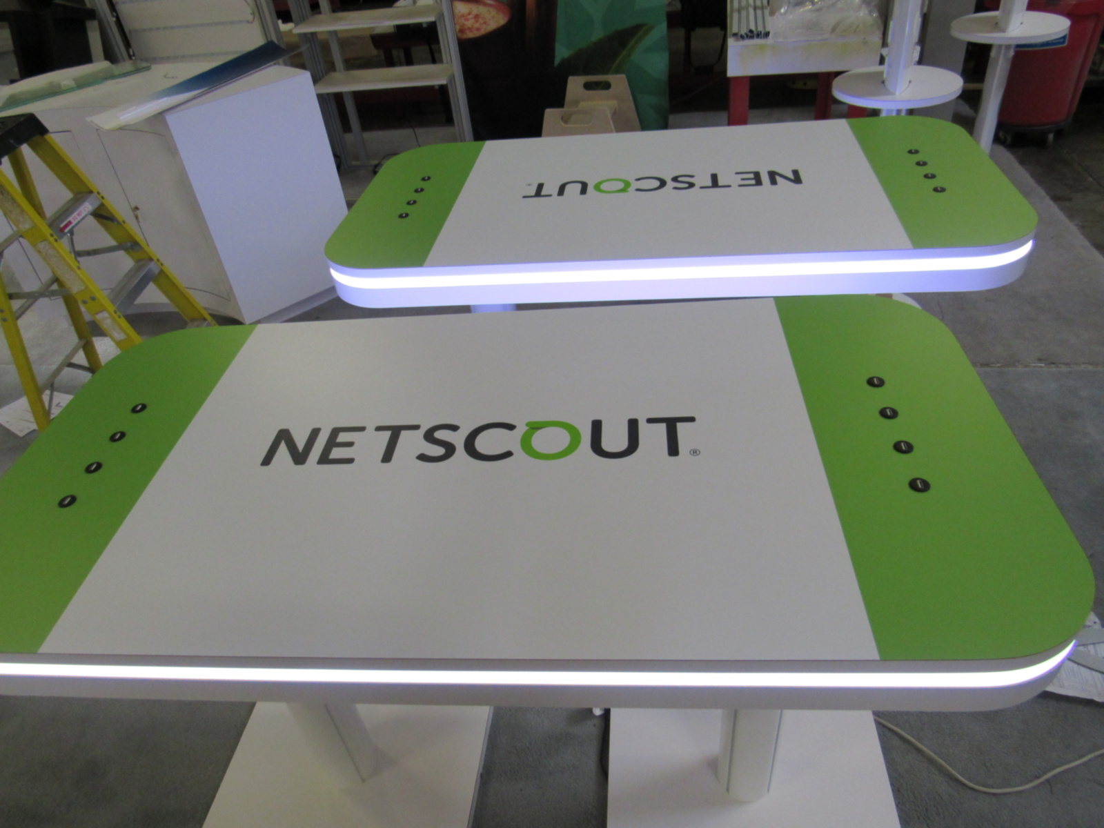 RENTAL: RE-1235 Half Circle Counter/Bar, RE-708 Charging Station Table, Sintra Infill Graphics for Counter, and Top Surface Vinyl Graphic for Charging Table