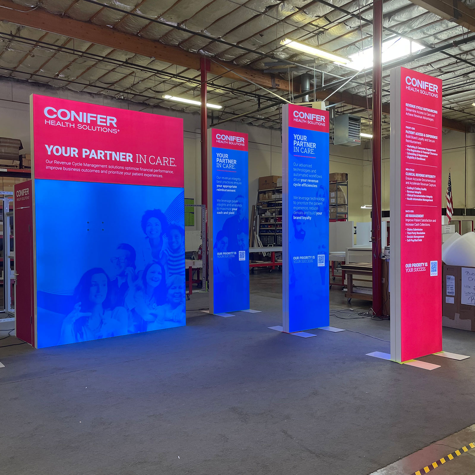 RENTAL: Modified RE-9084 Island Design with Gravitee Panel System Storage Closet with Locking Door, (3) Double-Sided Lightboxes, (3) RE-1219 Square Workstation Counters, 10’ Square Hanging Sign, (6) LED Arm Lights, (4) Monitor Mounts, (3) 43" Monitors, (1) 65" Monitor, SEG Fabric Graphics, RE-704 Charging Station Tables, SEG Fabric Graphics, and Vinyl Applied Graphics