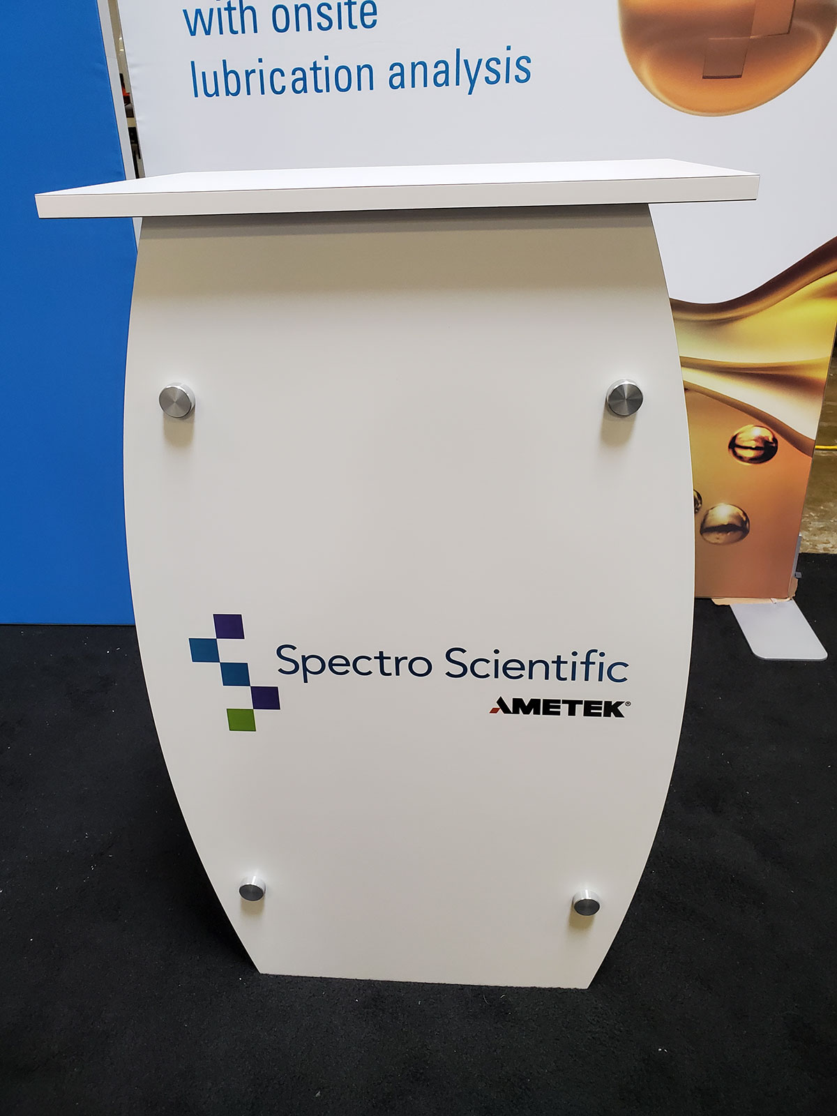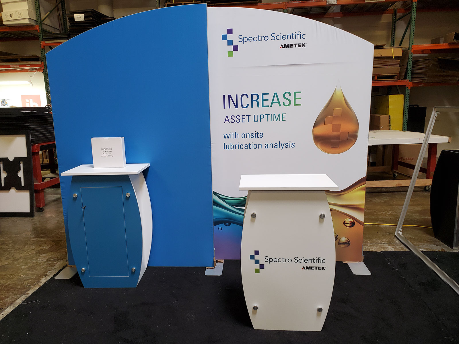 Modified SYK-1046 Symphony Portable Display with Arch Frames. SEG Fabric Graphics, Monitor Mount, and SYM-408B Backwall Counter with Locking Storage