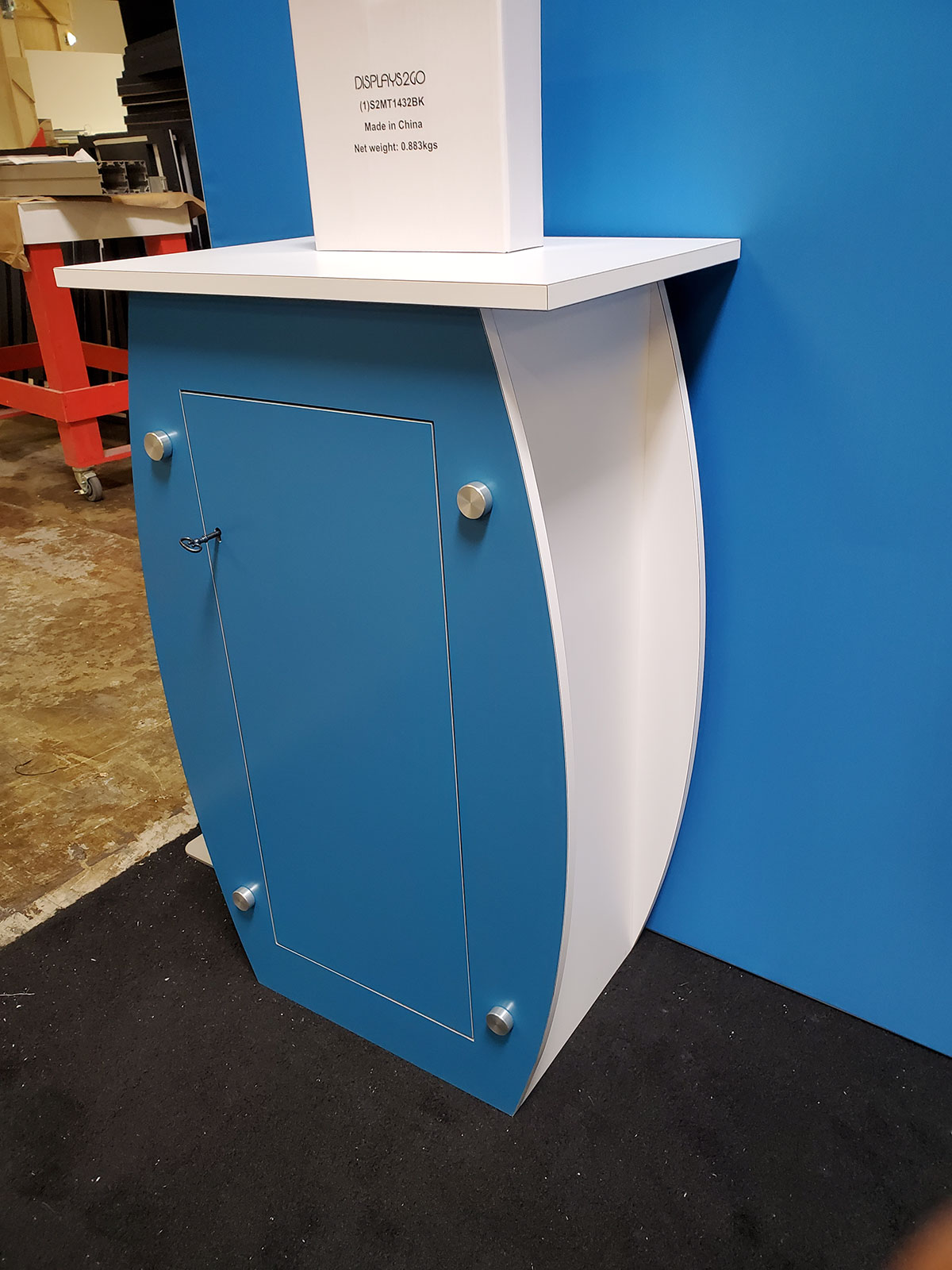 Modified SYK-1046 Symphony Portable Display with SEG Fabric Graphics, SYM-408B Backwall Counter with Locking Storage, and Monitor Mount [59967]
