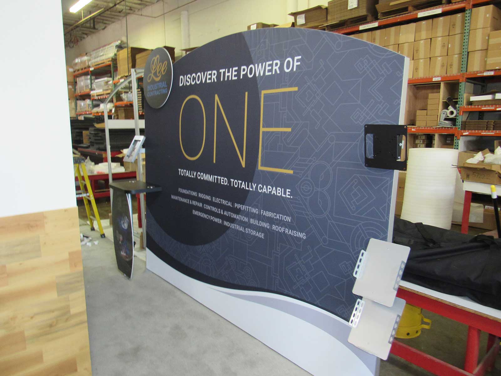 Custom 4-Sided Symphony Exhibit with Curved and Flat SEG Frames, Tension Fabric Graphics, Monitor Mount, and SYM-406 and SYM-412 Portable Counters [57704]