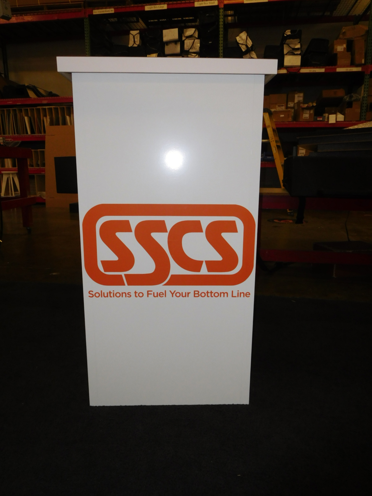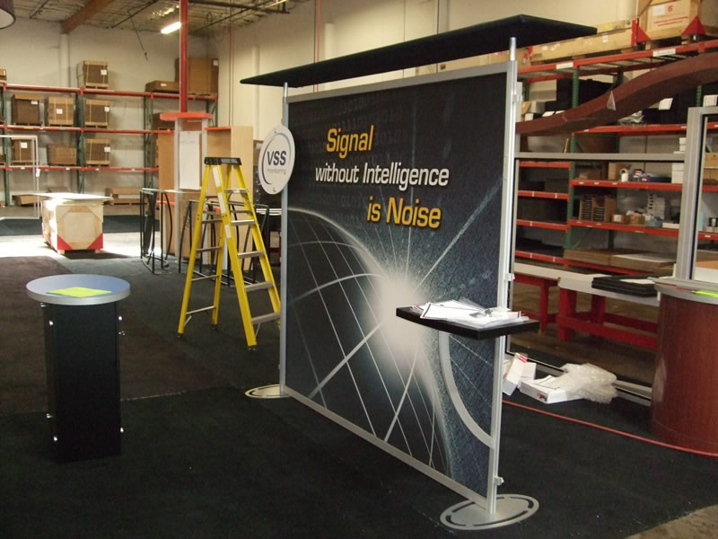 VK-1230 Hybrid Trade Show Booth, Large Format Tension Fabric Graphic, (2) USB Charging Ports, (2) Concave or Convex Two-Piece Wings, (2) 5 Watt LED Lights, Monitor Mount, LT-132 Trade Show Pedestal, Hundreds of Laminate Finishes, Locking Door and Shelf [52248]
