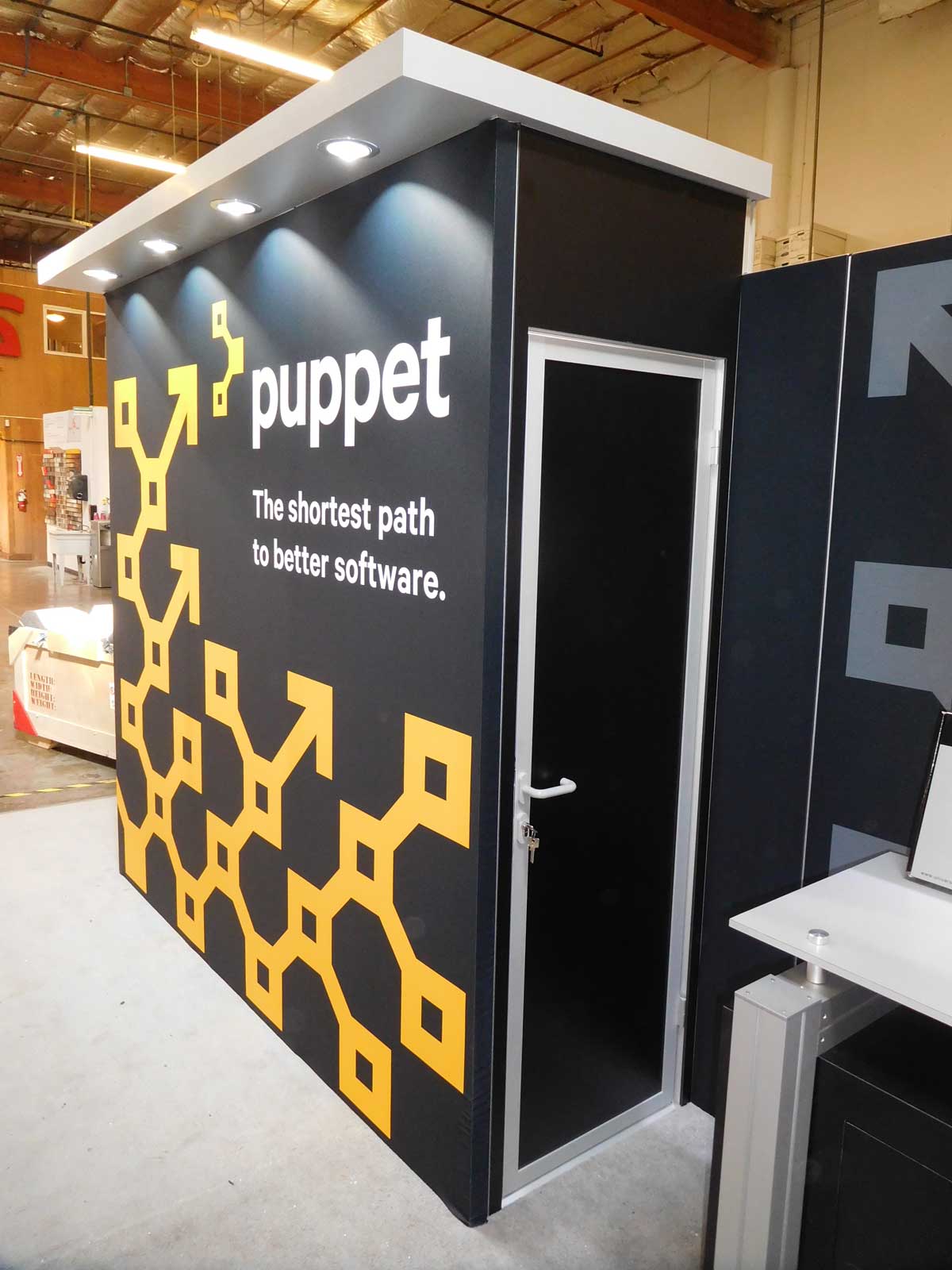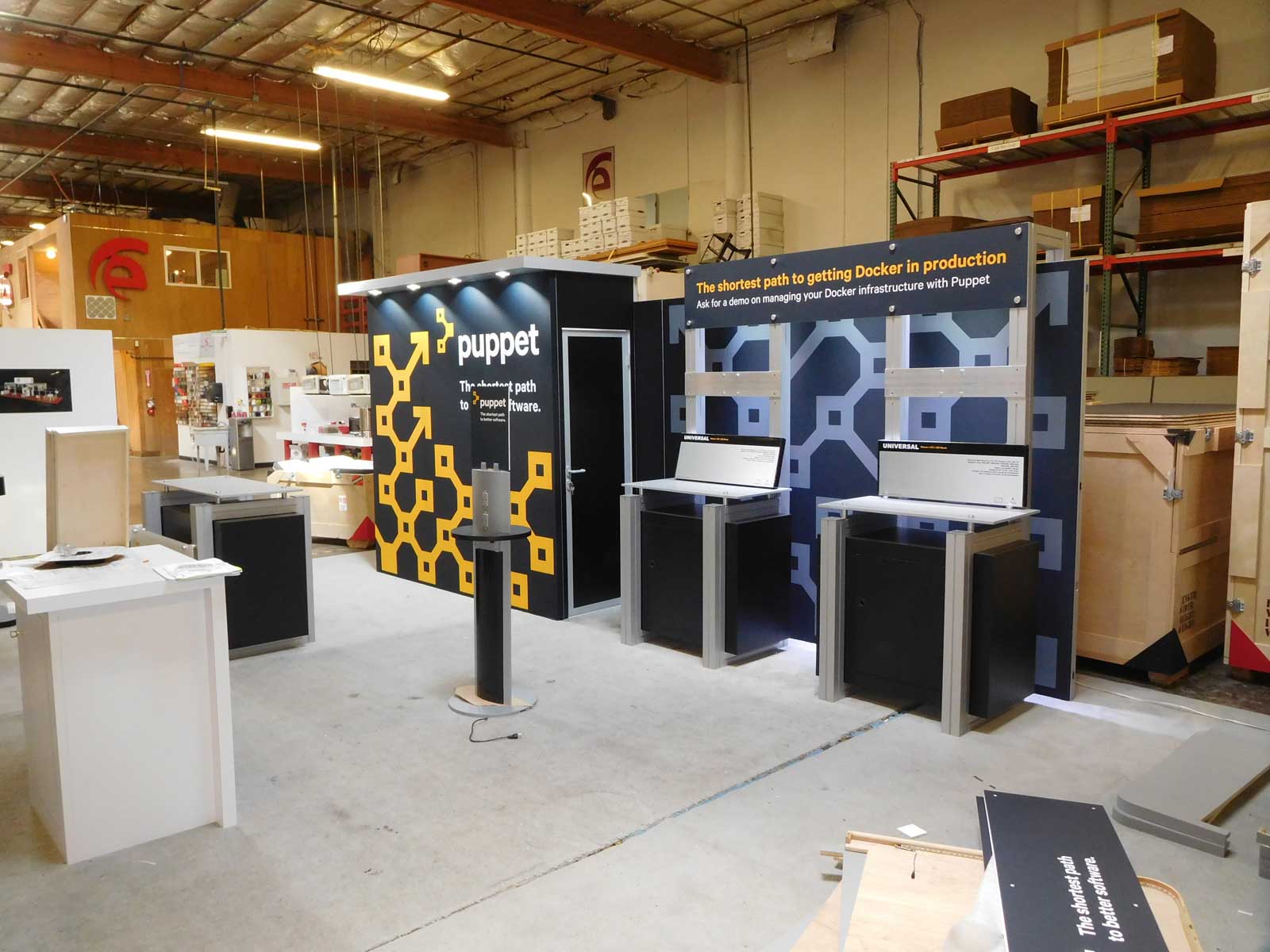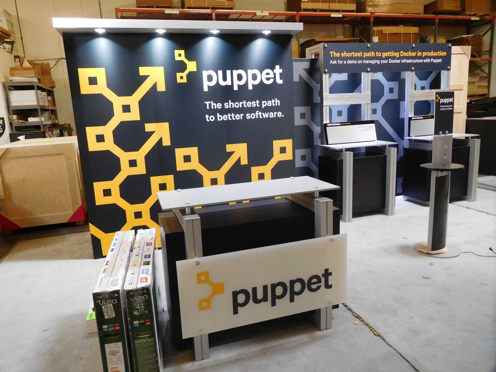 VK-2911 and VK-1316 Hybrid Exhibits with Tension Fabric Exhibits, Puck Lights, Modified MOD-1157 Counter with Locking Storage, Full-size Closet, Monitor Mount, and MOD-1431 Charging Tower VK-2911 and VK-1316 Hybrid Kits VK-2911 and VK-1316 Hybrid Kits MOD-1431 Charging Tower