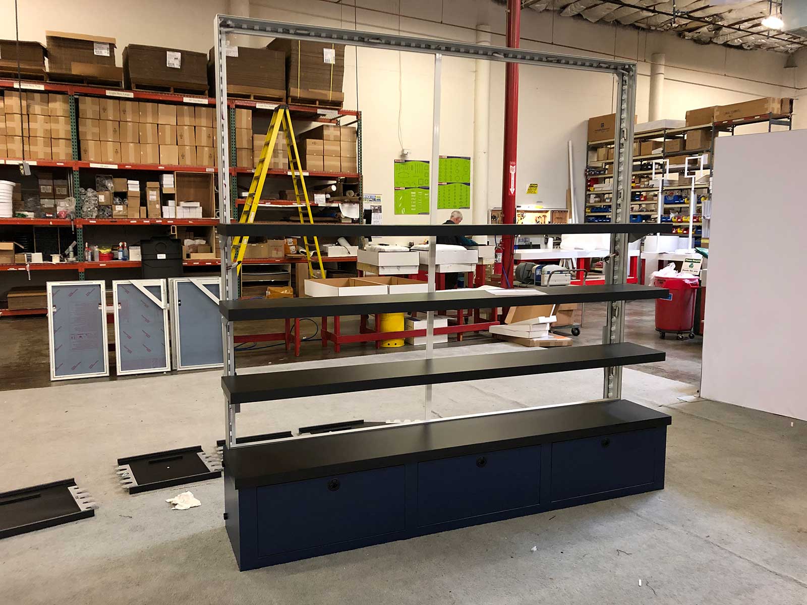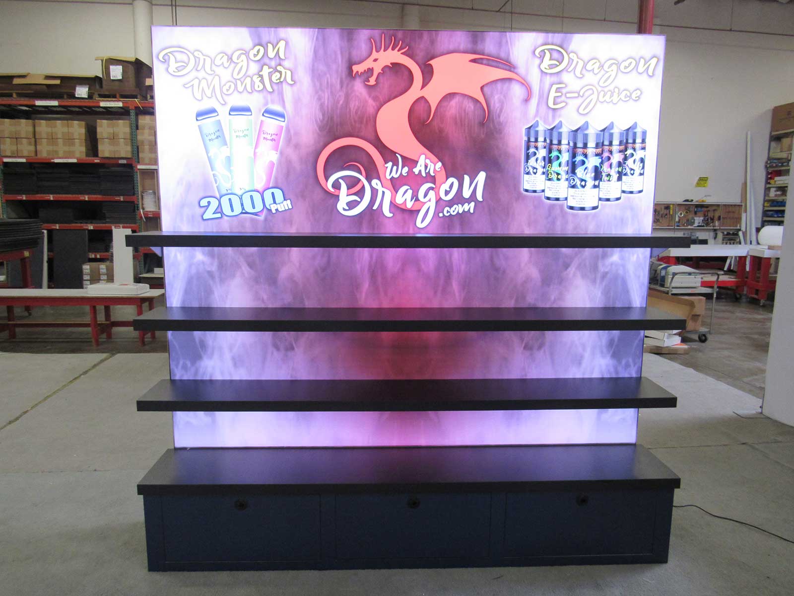 Modified VK-1963 SuperNova Lightbox with (2) Full Length Shelves, Base Cabinet with Locking Storage, and SEG Fabric Graphic Modified VK-1963 SuperNova Lightbox with (2) Full Length Shelves, Base Cabinet with Locking Storage, and SEG Fabric Graphic