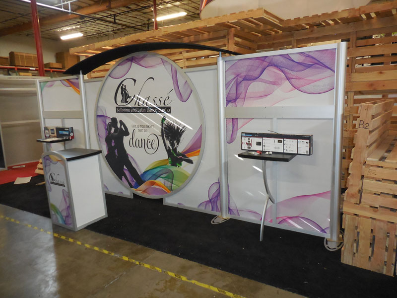 Modified VK-2936 Visionary Designs Hybrid Exhibit with (2) Monitor Mounts, Tension Fabric Graphics, and MOD-1297 Counter with Locking Storage [44284]