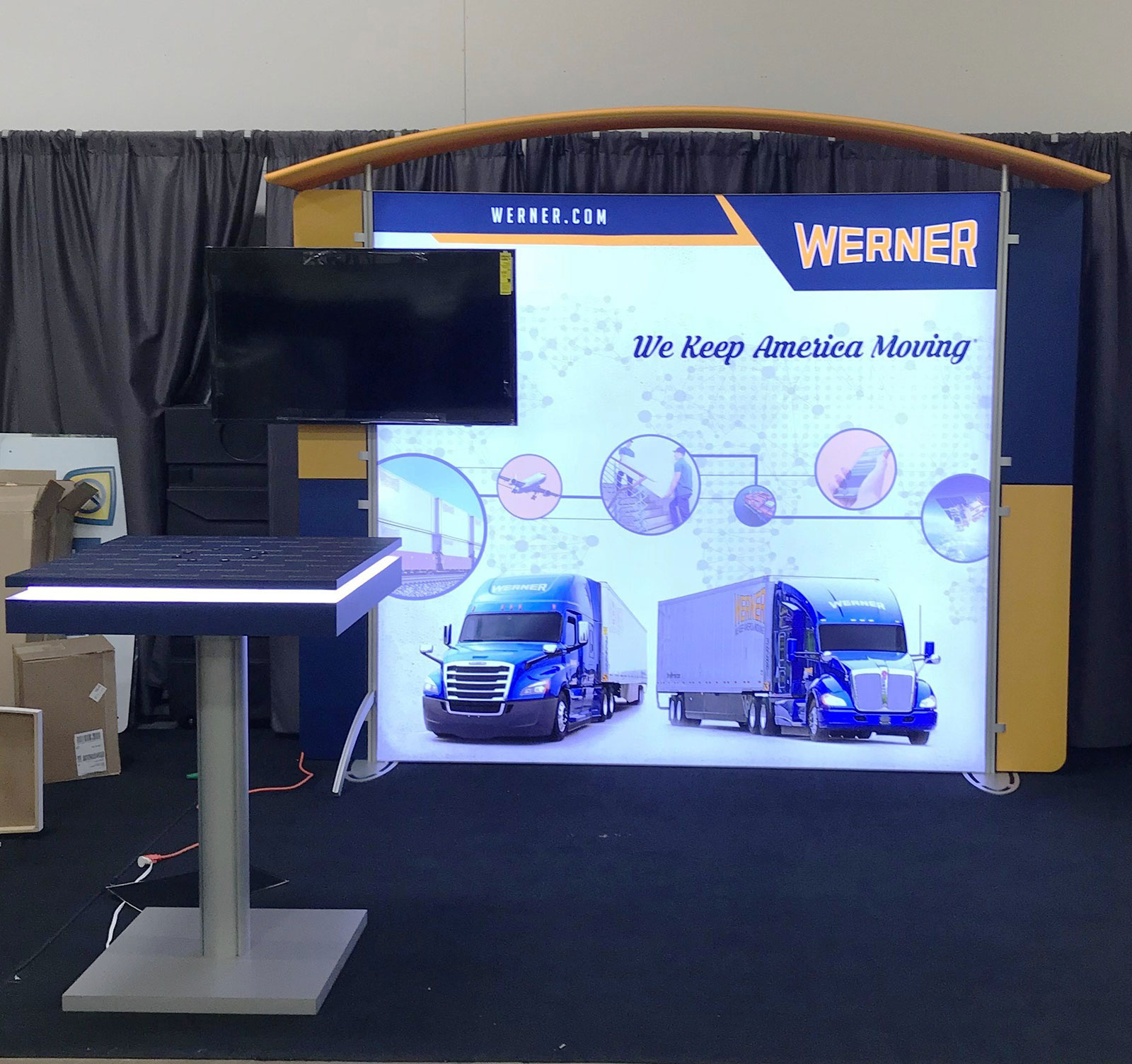 VK-1966 Backlit Inline Exhibit with Tension Fabric Graphics, Canopy, Wings, Monitor Mount, and Counter with Locking Storage [57877]
