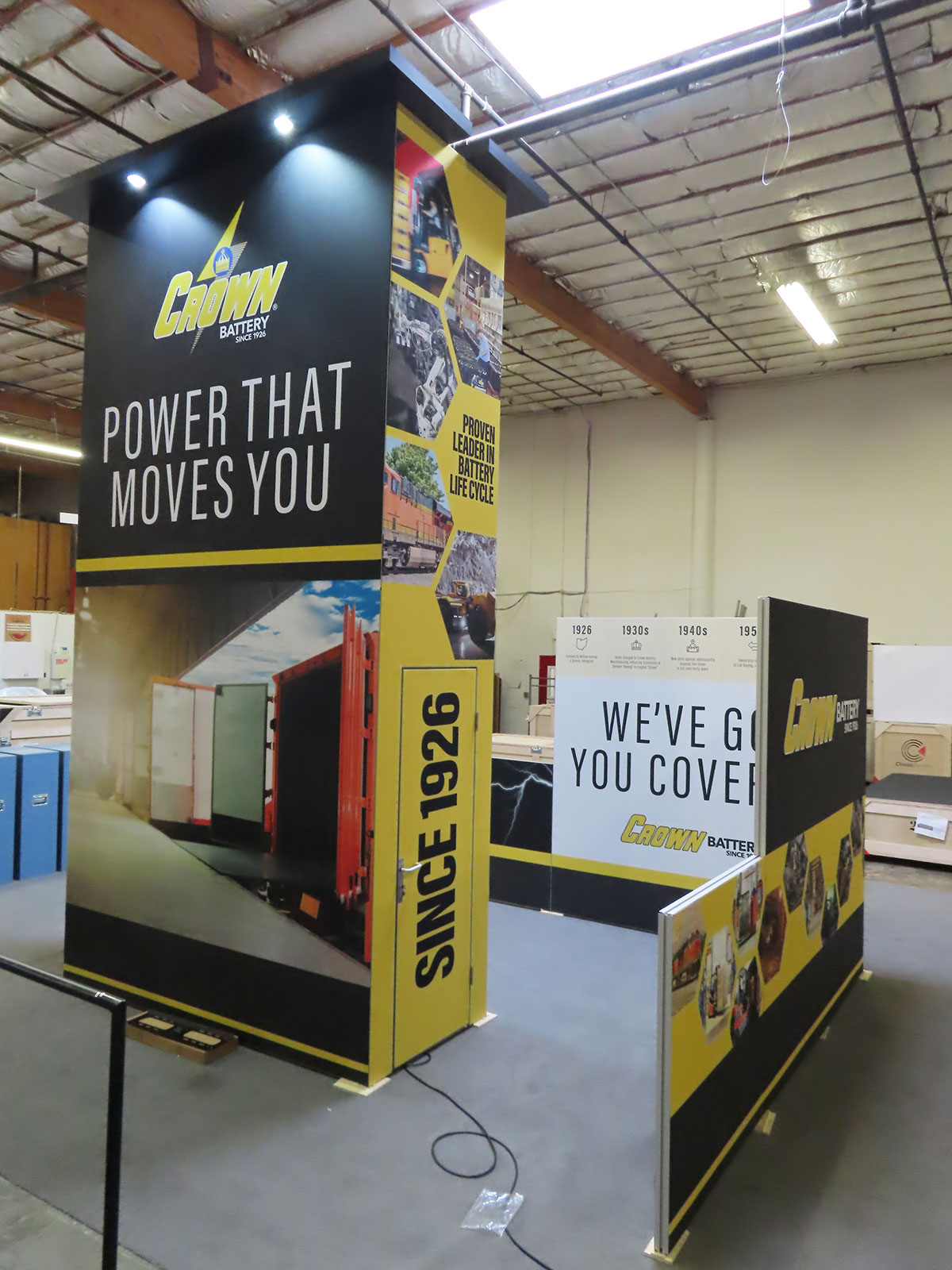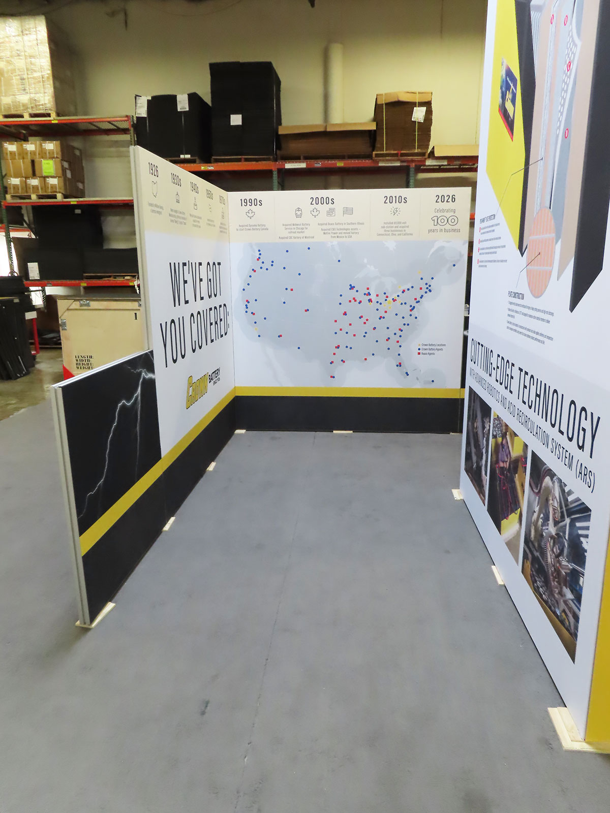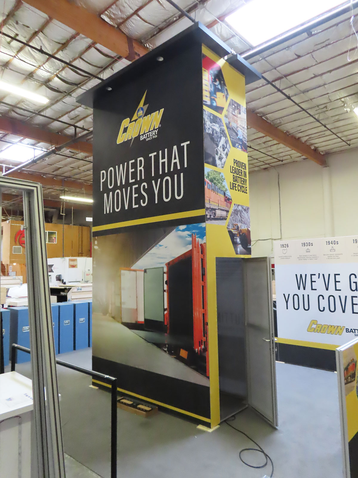 16 ft. Gravitee Tower with Storage Closet, SEG Fabric Graphics, Laminated Ceiling, Puck Lights, and L-shaped Divider Wall with Fabric Graphics [ORD-66991]
