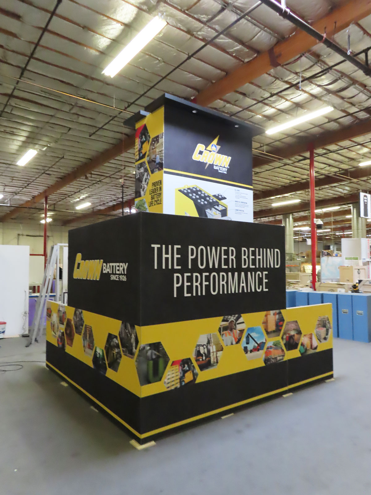 16 ft. Gravitee Tower with Storage Closet, SEG Fabric Graphics, Laminated Ceiling, Puck Lights, and L-shaped Divider Wall with Fabric Graphics 16 ft. H Gravitee Tower with Storage Closet Island Design -- View 2 16 ft. H Gravitee Tower with Storage Closet Island Design -- View 3 16 ft. H Gravitee Tower with Storage Closet Island Design -- View 4 16 ft. H Gravitee Tower with Storage Closet Island Design -- View 5