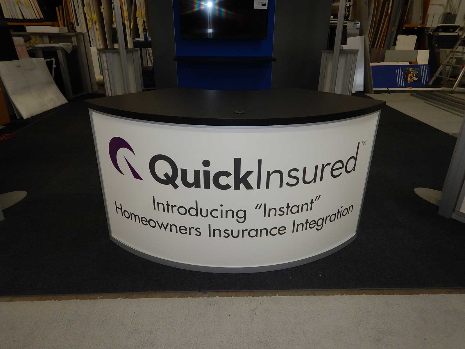 RENTAL: Island Design with (4) Curved Headers, Double-Sided Kiosk with (2) 55" Monitors and Large Monitor Supports, and (2) Black Laminated Shelves, (4) RE-1219 Square Pedestals with Locking Doors and Interior Shelves, (4) Small Monitor Mounts, RE-1205 Large Curved Reception Counter with Locking Door and Interior Shelf, (4) RE-170 Literature Shelves, PVC Header Graphics, and Silicone Edge Fabric Kiosk Graphics.