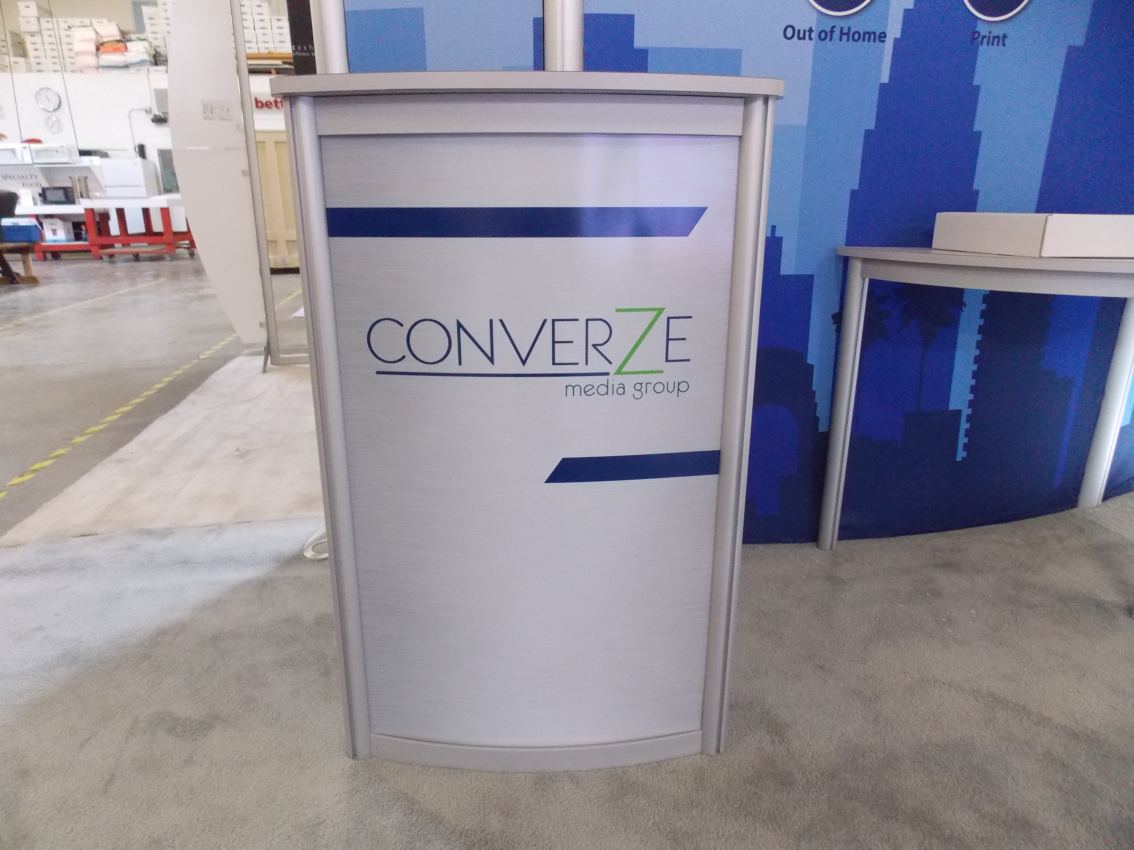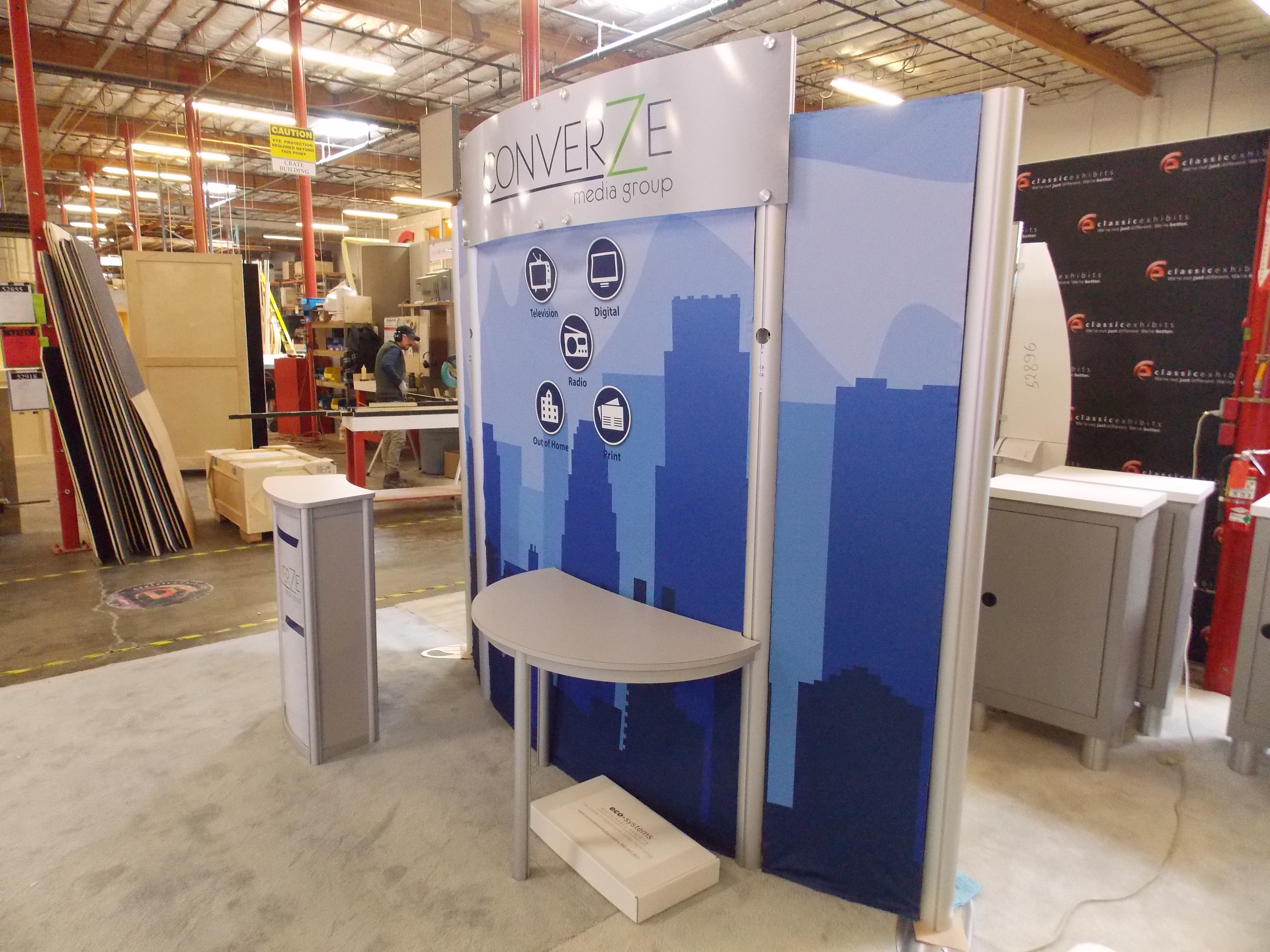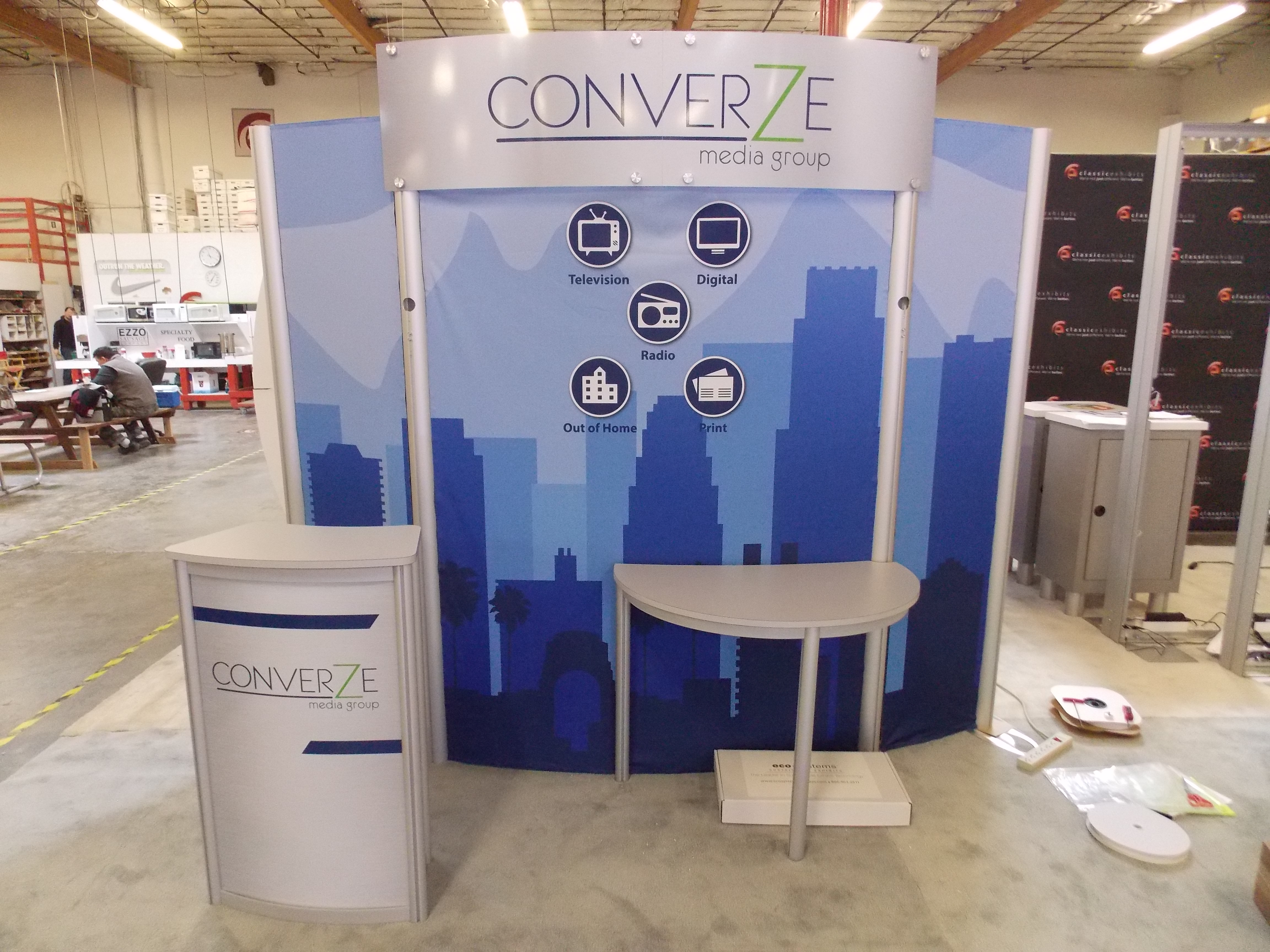 ecoSmart Modified ECO-1035 Contemporary Sustainable Exhibit, Lightweight Recyclable Aluminum Frames, Attached Table (2) Monitor Mounts, 2 Piece Eco-Board Header, (3) Tension Fabric Graphics and an ECO-20C Counter with Eco-Board Front Graphic and Locking Storage [52809]