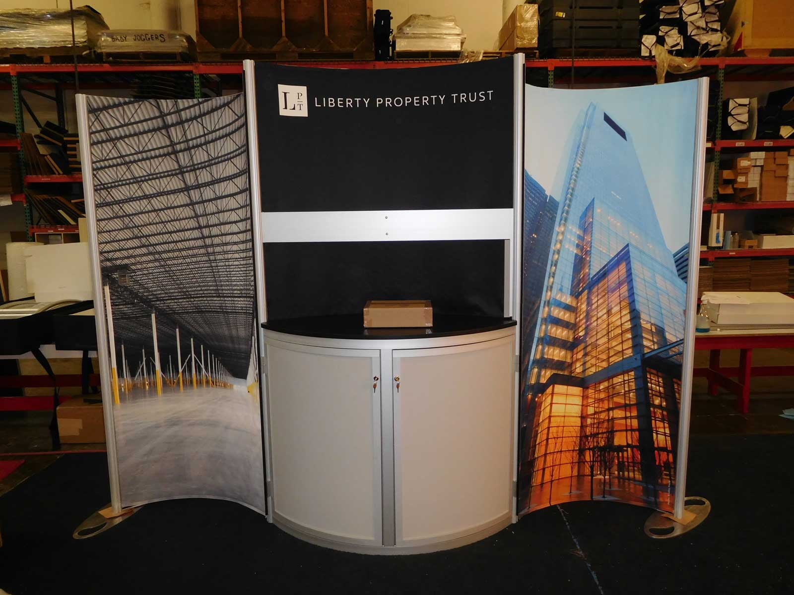 Modified eSmart ECO-2069 Sustainable Exhibit with Aluminum Extrusion Frame, Tension Fabric Graphics, Locking Storage, Pedestal, and Re-configurable Additions [50429]