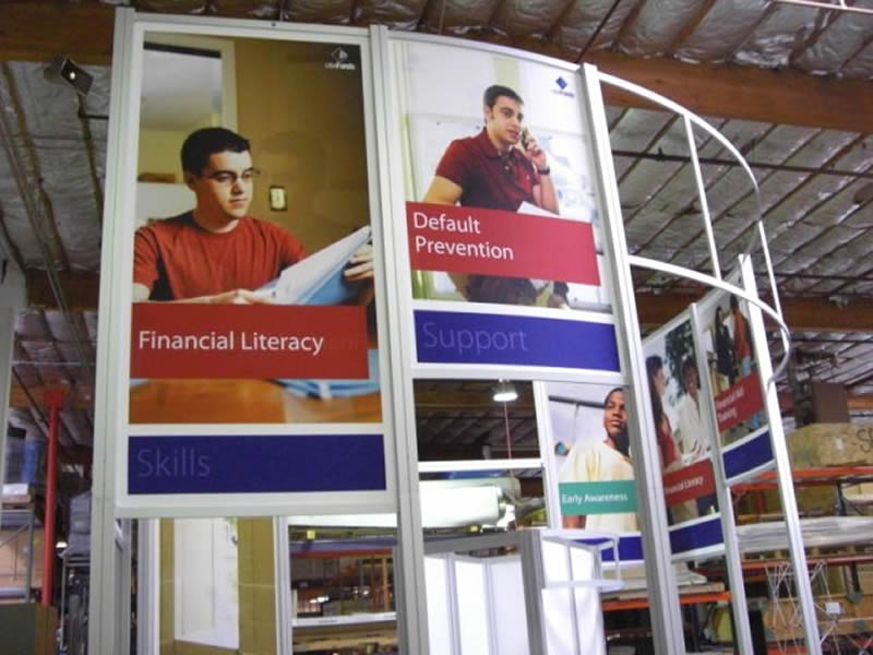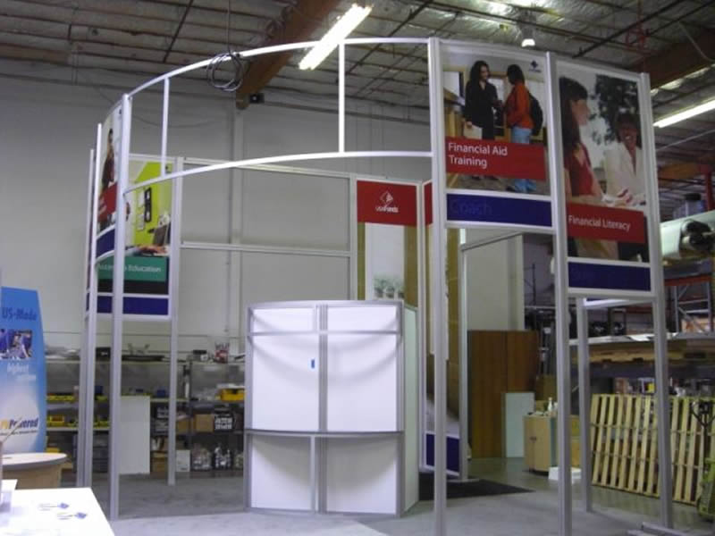 RENTAL Exhibit -- 20� x 20� island with 16� extrusion structure, tension fabric beaded-installed graphics, storage room with locking door, curved extrusion header, curved counter.